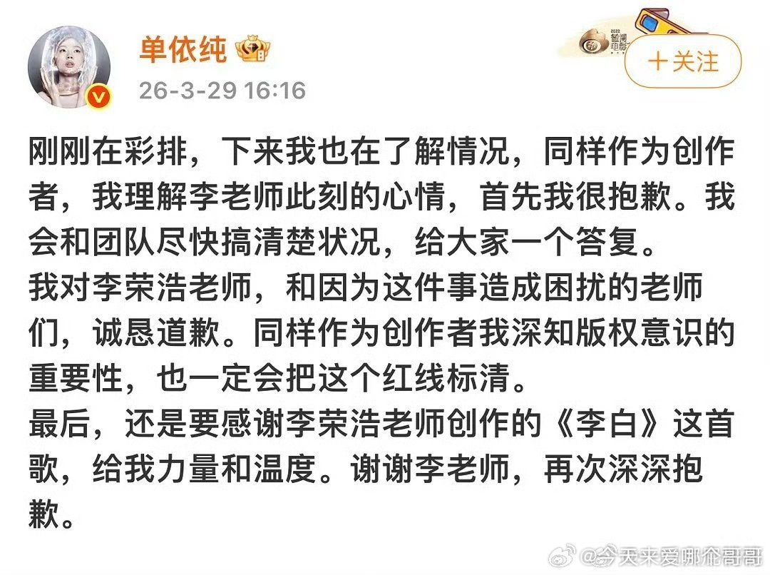 单依纯道歉了说会尽快搞清楚状况,但她是演唱会的总监制