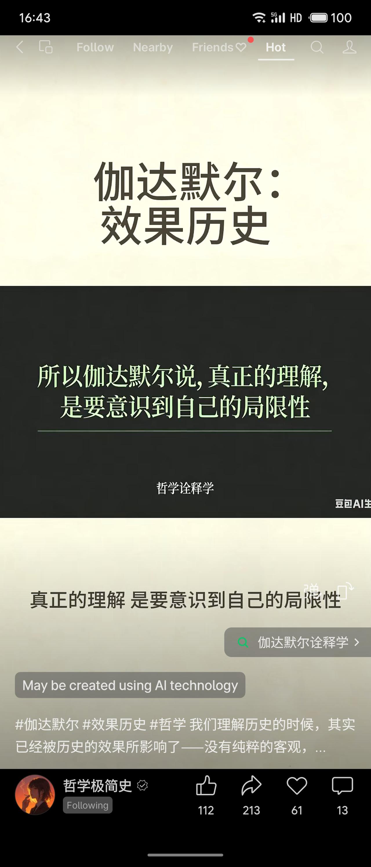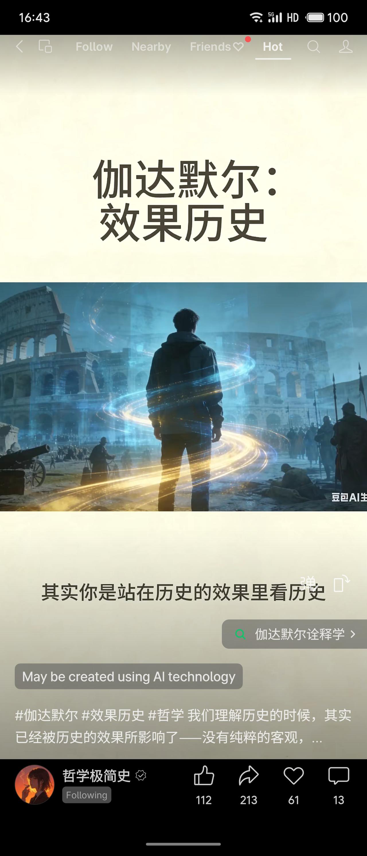 伽达默尔的“效果历史”是指:我们理解历史时,本身就置身于历史产生的影响之中,没有绝对客观的旁观者。我们的认知被历史效果预先塑造,所以真正的理解不是消除偏见,而是意识到自己的局限性,理解自身视域与历史视域如何融合。