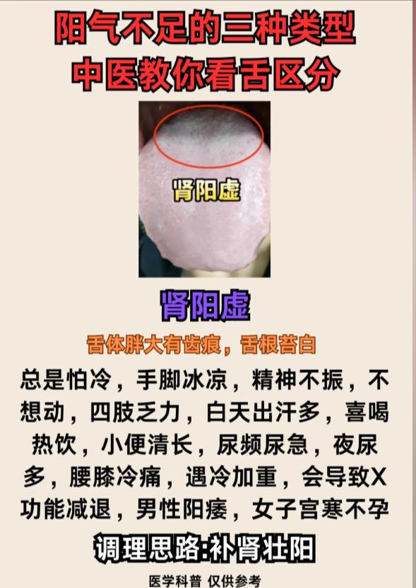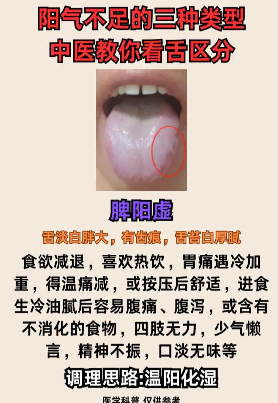 阳气不足分 3 种:心阳虚、脾阳虚、肾阳虚,看舌就能分清