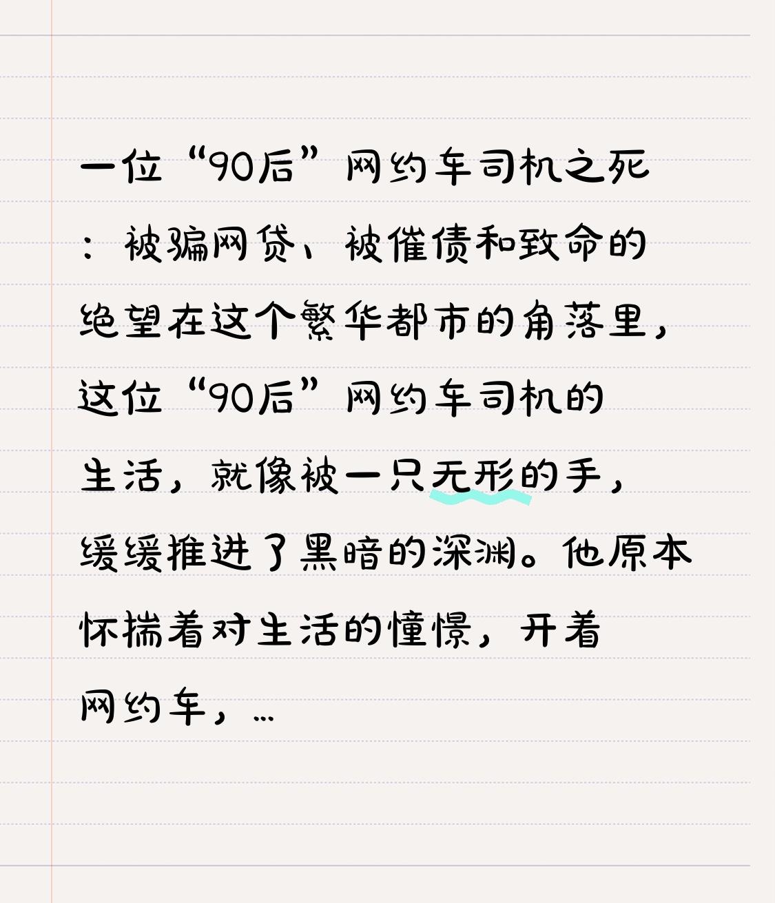 一位“90后”网约车司机之死:被骗网贷、被催债和致命的绝望在这个繁华都市的角落里,这位“90后”网约车司机的生活,就像被一只无形的手,缓缓推进了黑暗的深渊。 他原本怀揣着对生活的憧憬,开着网约车,虽辛苦但也能勉强维持生计。然而,一次看似平常的借贷广告,却成了他噩梦的开端。那些无良的网贷平台,用诱人的低息幌子,让他轻易地陷入了借贷陷阱。起初,只是一笔小小的借款,他以为自己能按时还清。可随着利息像雪球一样越滚越大,他渐渐发现自己无力偿还。 催债电话如同密集的子弹,不分昼夜地轰炸着他。每一个电话都像是沉重的榔头,一下又一下地敲击着他的神经。催债人恶语相向,威胁他,甚至骚扰他的家人和朋友。他的生活彻底乱了套,工作时常常走神,收入也越来越少。 他害怕面对家人失望的眼神,害怕看到朋友异样的眼光。每天回到狭小的出租屋,他都觉得自己像是被世界抛弃的孤魂。夜晚,他常常望着天花板,想着自己该如何摆脱这无尽的债务。无数个夜晚,泪水浸湿了枕头,但他却找不到任何解决的办法。 终于,在一个风雨交加的夜晚,绝望像潮水一般将他彻底淹没。他再也承受不住这份压力,做出了那个致命的决定。他的离去,像是一颗石子投入了平静的湖面,在亲人和朋友的心中激起了巨大的涟漪。 这件事也引起了社会的广泛关注,人们开始反思网贷行业的乱象,呼吁加强监管,避免更多的人陷入这样的悲剧。希望这样的故事不再重演,让每一个怀揣梦想的年轻人,都能在生活的道路上,少一些陷阱,多一些希望。
