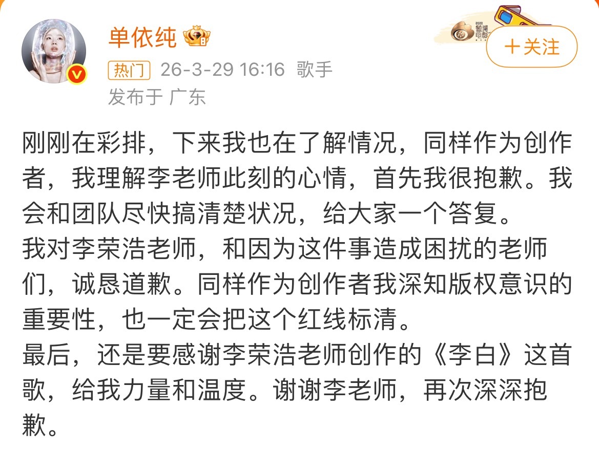 如何呢 又能怎李荣浩 单依纯强行侵权总结版:李荣浩喊话单依纯,称对方在婉拒翻唱授权的情况下,强行侵权演唱《李白》,另外,歌手节目中的翻唱导致他被调侃,他全程没吭声,还一直夸她。随后单依纯发文道歉说会尽快核实情况。俩人这么多年的羁绊真的很深了