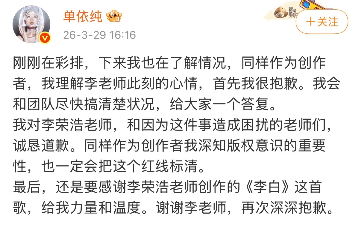 单依纯回应强行侵权并道歉:会和团队尽快搞清楚状况,给大家一个答复。
