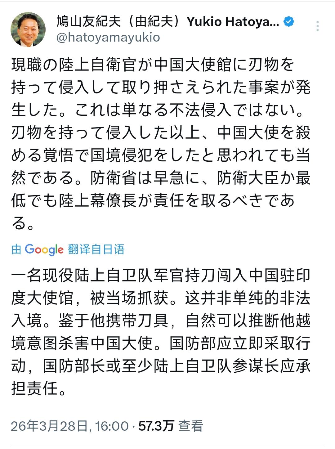 日本前首相鸠山由纪夫3月28日写道:“一名现役陆上自卫队军官持刀闯入中国驻日本大