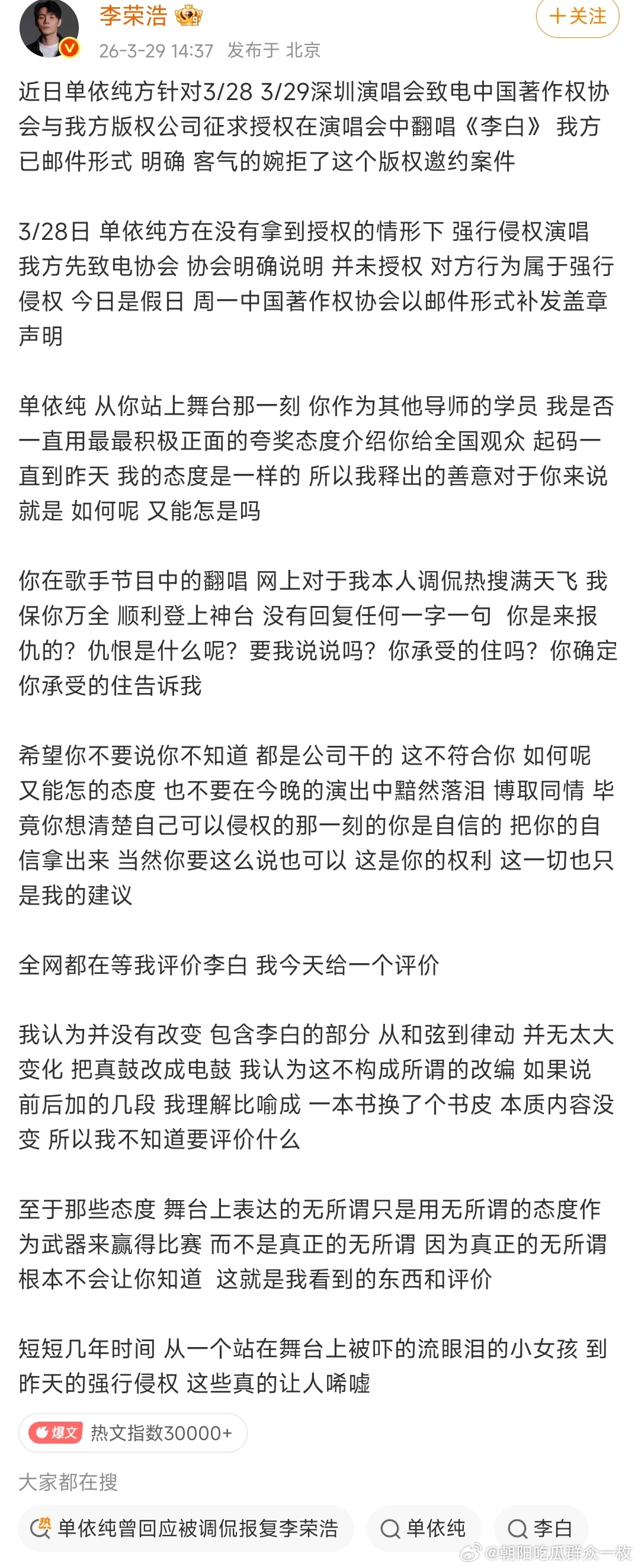 李荣浩 单依纯强行侵权单依纯回应侵权并道歉。