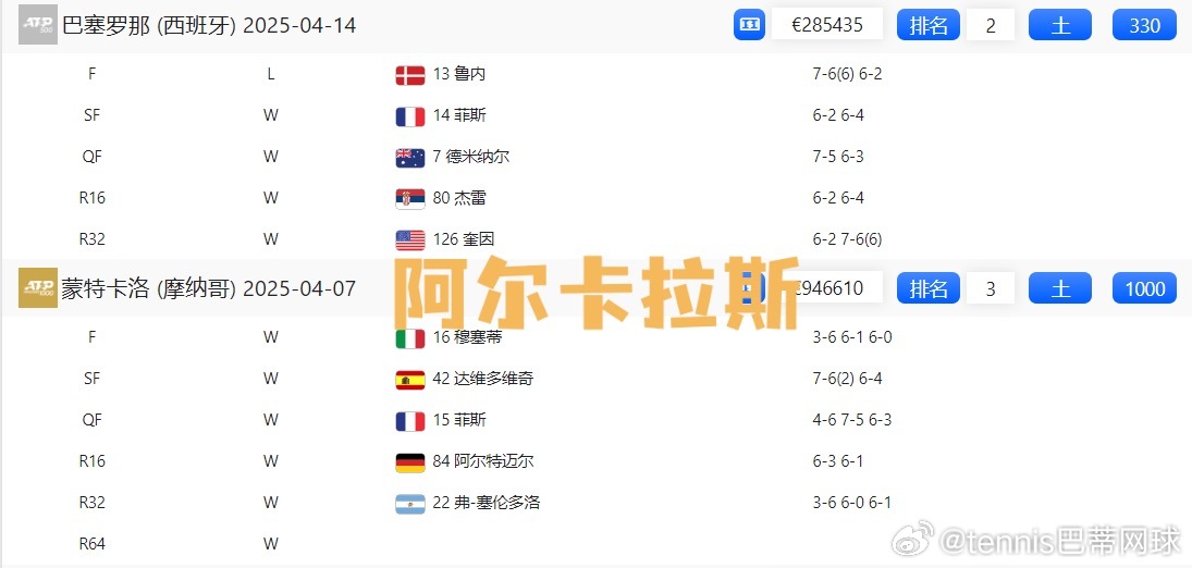 🇪🇸阿尔卡拉斯:蒙特卡洛🏆,巴塞罗那🥈,罗马🏆,法网🏆;1000+330+1000+2000=4330
