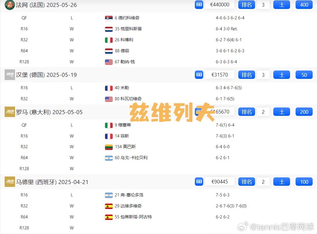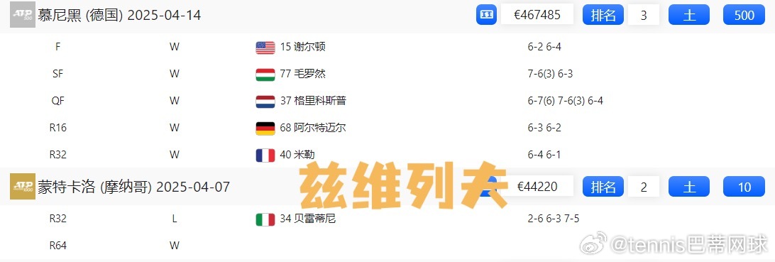 🇩🇪兹维列夫:蒙特卡洛首秀出局,慕尼黑🏆,马德里R16,罗马8强,汉堡16强,法网8强;10+500+100+200+50+400=1260