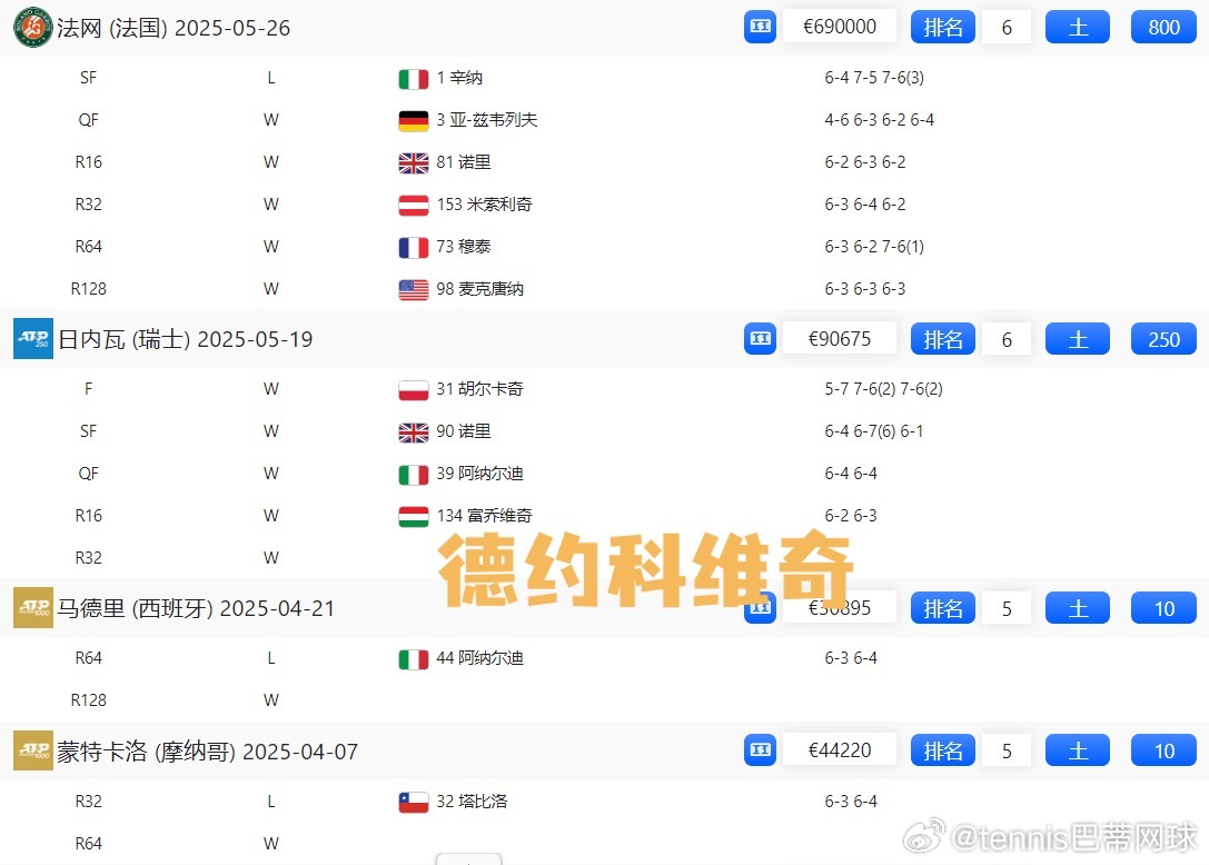🇷🇸德约科维奇:蒙特卡洛,马德里均首秀出局 ,日内瓦🏆,法网四强 ;800+250+10+10=1070