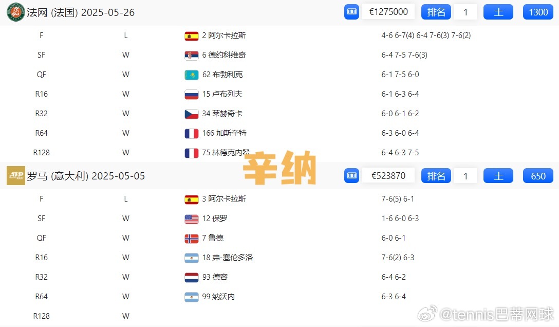 🇮🇹辛纳:罗马🥈,法网🥈;650+1300=1950