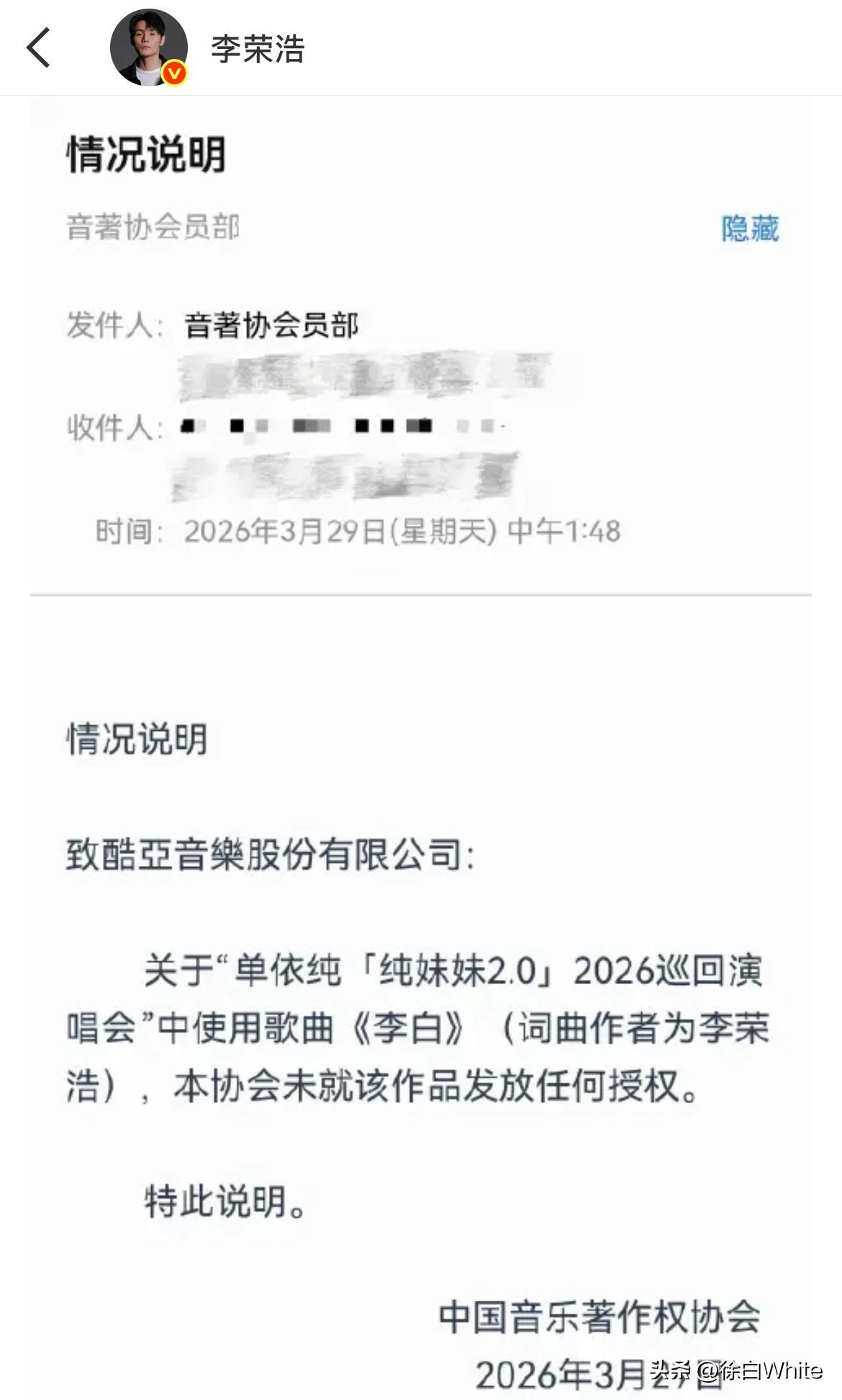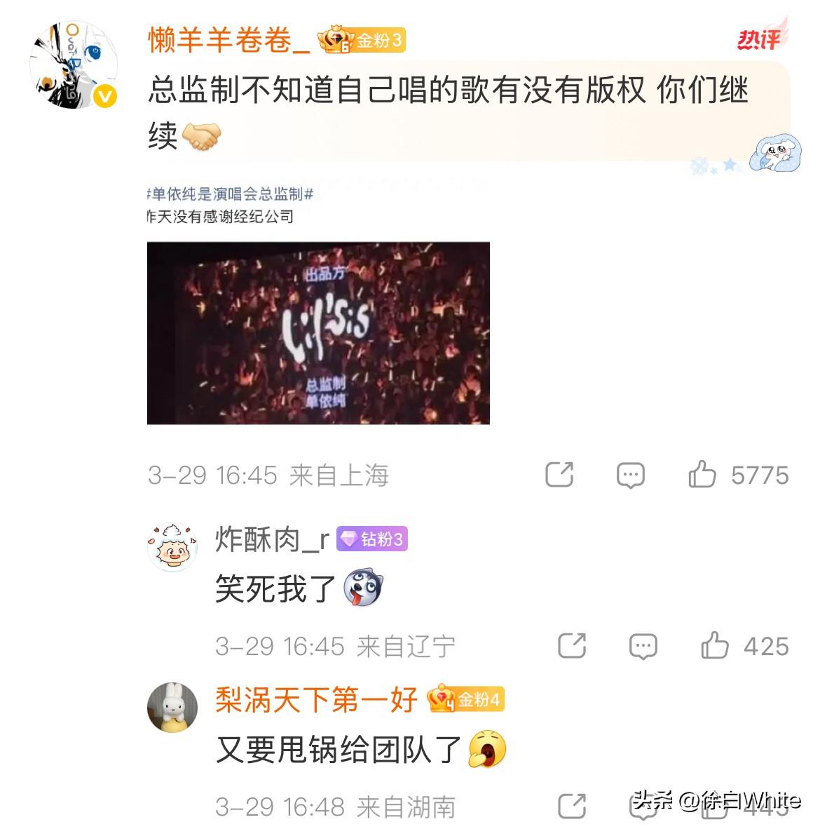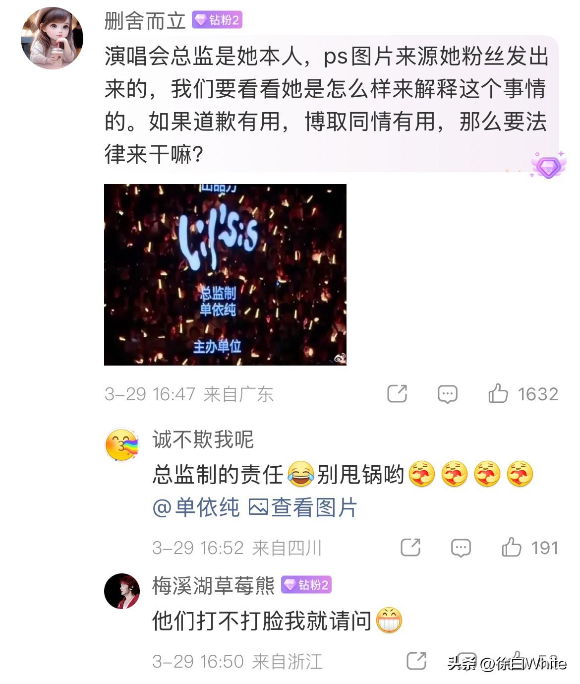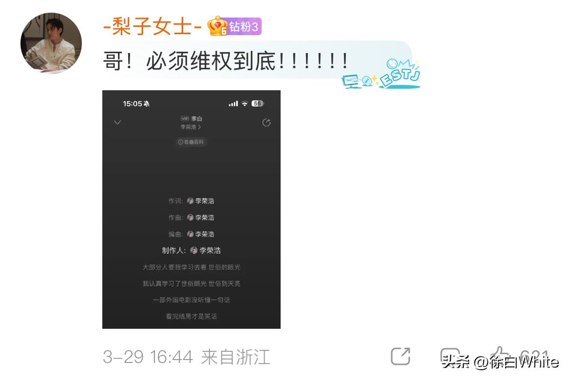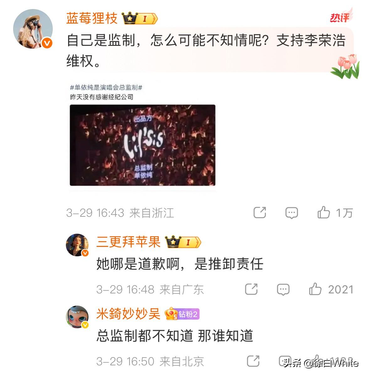 3月29日,李荣浩不接受单依纯的道歉! 这次气更大了!再次发文质问单依纯,没有我的授权,请问你用什么立场?什么权利?什么角度?什么心态演唱? 最后直接来了一句,我倒要看看今天哪个*的团队能把这个明目张胆的*糊弄过去!!! 我刚才就说了,单依纯这个道歉李荣浩不满意,不会接受,果不其然,李荣浩看到自己预判了单依纯的道歉,单依纯还把责任推到团队后,更生气了,真不如一句对不起! 本来只需要支付版权费的事,如今要支付侵权费了,闹成这样,这首歌估计也唱不了了,单依纯还有哪首歌出名?毫无印象……