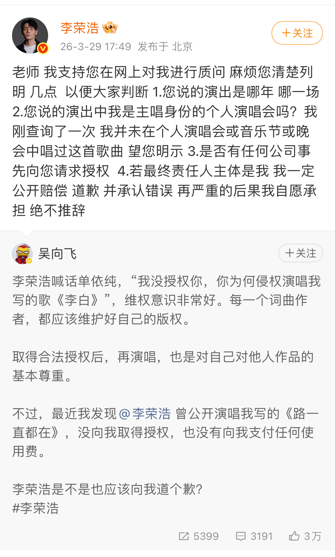 吴向飞加入战场,说李荣浩曾在演唱会唱《路一直都在》,没向他确取得授权,也没有向他支付任何费用p3李荣浩回应吴向飞李荣浩预判 吴向飞喊话李荣浩道歉