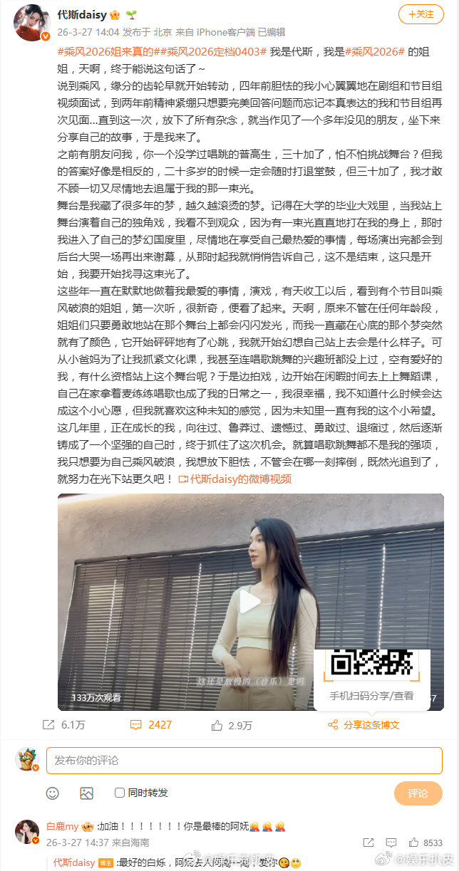 代斯回复白鹿美女贴贴太甜啦,友谊长存~乘风2026代斯