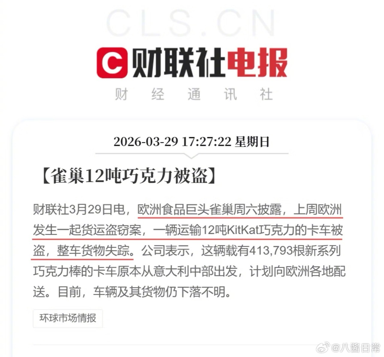 欧洲发生巧克力棒大劫案,雀巢41万根巧克力被盗雀巢12吨巧克力被盗