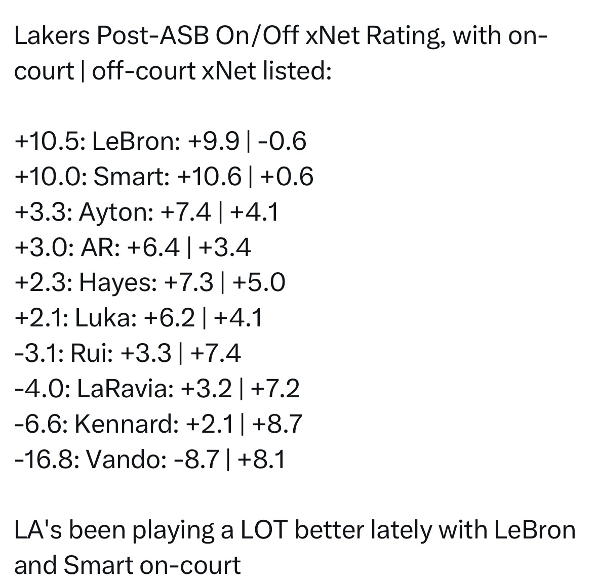 On/Off差值 | 球员名:在场xNet | 不在场xNet+10.5:勒布朗-詹姆斯:+9.9 | -0.6+10.0:马库斯-斯玛特:+10.6 | +0.6+3.3:德安德烈-艾顿:+7.4 | +4.1+3.0:奥斯汀-里夫斯:+6.4 | +3.4+2.3:贾克森-海斯:+7.3 | +5.0+2.1:卢卡-东契奇:+6.2 | +4.1-3.1:八村塁:+3.3 | +7.4-4.0:杰克-拉拉维亚:+3.2 | +7.2-6.6:卢克-肯纳德:+2.1 | +8.7-16.8:贾里德-范德比尔特:-8.7 | +8.1