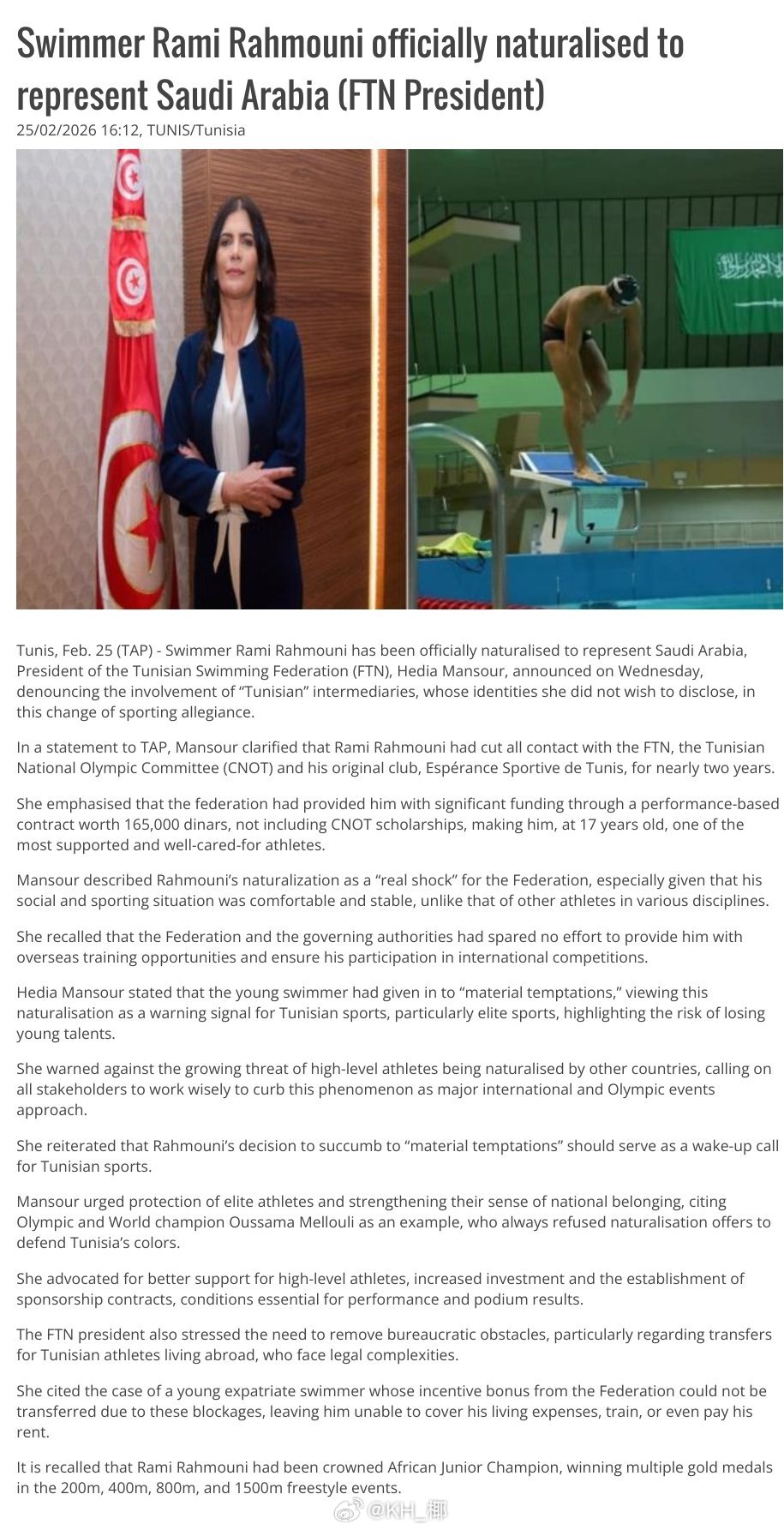 突尼斯泳联主席公开表达强烈不满,称这是对突尼斯游泳的“沉重打击”。她指责事件背后存在“物质诱惑”,并透露沙特方面为 Rami 提供了价值约16.5万第纳尔(约合5.5万美元)的绩效合同及额外奖金。