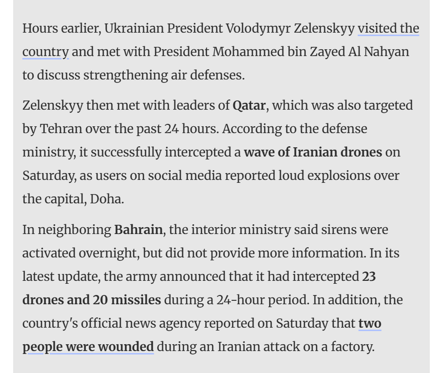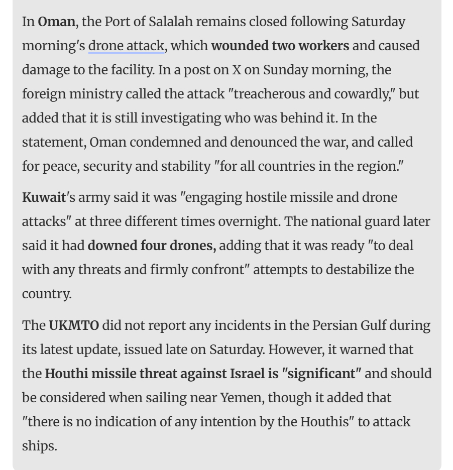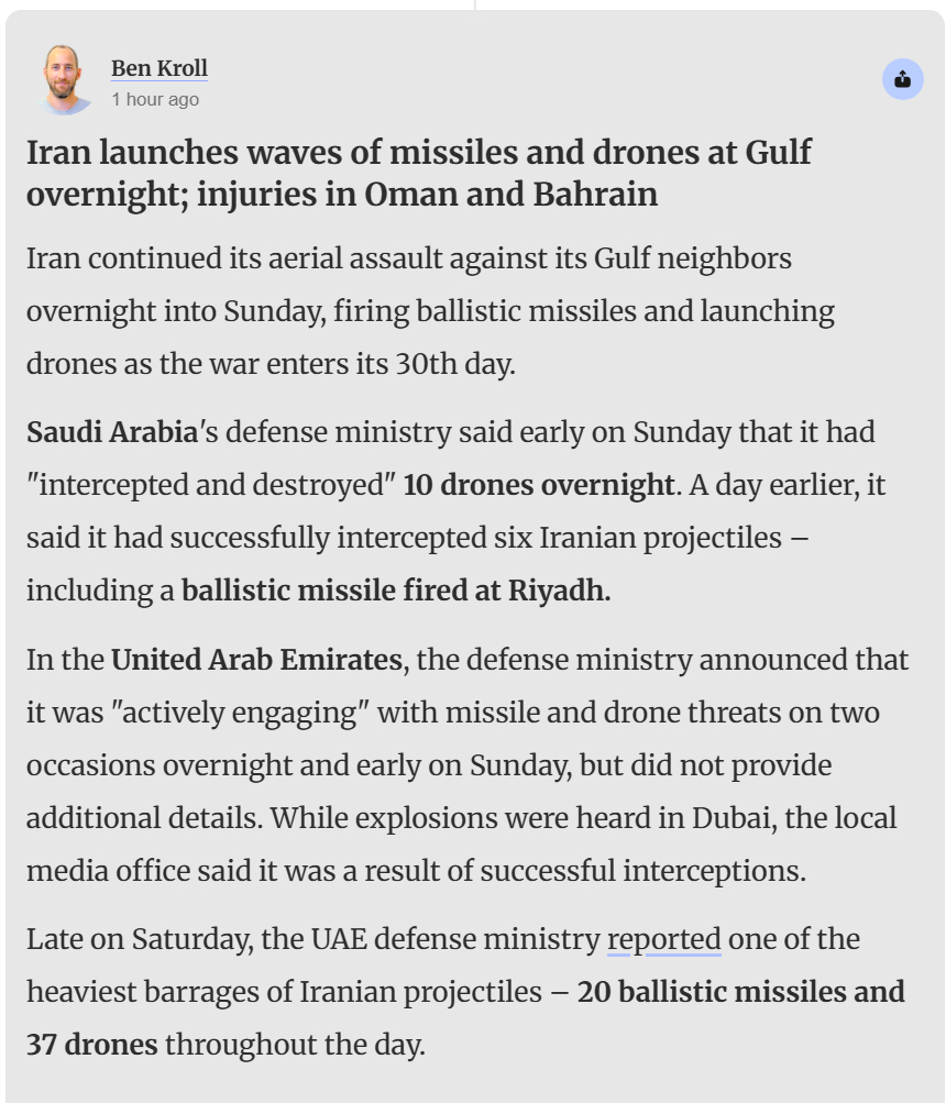 🔻随着战争进入第 30 天,伊朗持续对海湾邻国发动空袭,于周日凌晨发射弹道导弹并出动无人机。🔻沙特阿拉伯国防部周日凌晨表示,已"拦截并摧毁"10 架夜间来袭的无人机。此前一天,该部称成功拦截了六枚伊朗发射物——其中包括一枚射向利雅得的弹道导弹。🔻在阿联酋,阿联酋国防部宣布其于周六夜间至周日凌晨两次"积极应对"导弹和无人机威胁,但未提供更多细节。迪拜当地虽传出爆炸声,但媒体办公室表示这是成功拦截的结果。周六深夜,阿联酋国防部报告称,伊朗全天发射了最密集的弹雨之一——20 枚弹道导弹和 37 架无人机。🔻乌克兰总统泽连斯基访问了该国,并与总统穆罕默德·本·扎耶德·阿勒纳哈扬会面,商讨加强防空系统事宜。泽连斯基随后会见了卡塔尔领导人,该国在过去 24 小时内同样成为德黑兰的攻击目标。据卡塔尔国防部称,卡塔尔于周六成功拦截了一波伊朗无人机,社交媒体用户报告称首都多哈上空传来巨大爆炸声。🔻在邻国巴林,巴林内政部表示夜间曾启动警报,但未提供更多信息。军方在最新通报中宣布,过去 24 小时内已拦截23 架无人机和 20 枚导弹。此外,该国官方通讯社周六报道称,有两人在伊朗对一家工厂的袭击中受伤。🔻在阿曼,萨拉拉港自周六清晨遭遇无人机袭击后持续关闭,事件造成两名工人受伤及港口设施受损。阿曼外交部周日上午发文谴责此次袭击"阴险懦弱",但同时表示仍在调查幕后主使。声明中阿曼对战争予以谴责,呼吁"地区所有国家"实现和平、安全与稳定。🔻科威特军方表示夜间三个不同时段遭遇"敌对导弹与无人机袭击"。科威特国民警卫队随后宣布击落四架无人机,并强调已做好准备"应对任何威胁,坚决挫败"破坏国家稳定的企图。🔻英国海上贸易行动办公室(UKMTO)周六深夜发布的最新报告中未提及波斯湾区域发生事故,但警告称胡塞武装对以色列的导弹威胁"极为严峻",航行至也门附近海域时应保持警惕,同时补充说明"目前无迹象表明胡塞武装有意袭击船只"。美军战斧导弹消耗速度震惊五角大楼胡塞伊朗黎巴嫩同步袭击以色列海外新鲜事中东现场直击