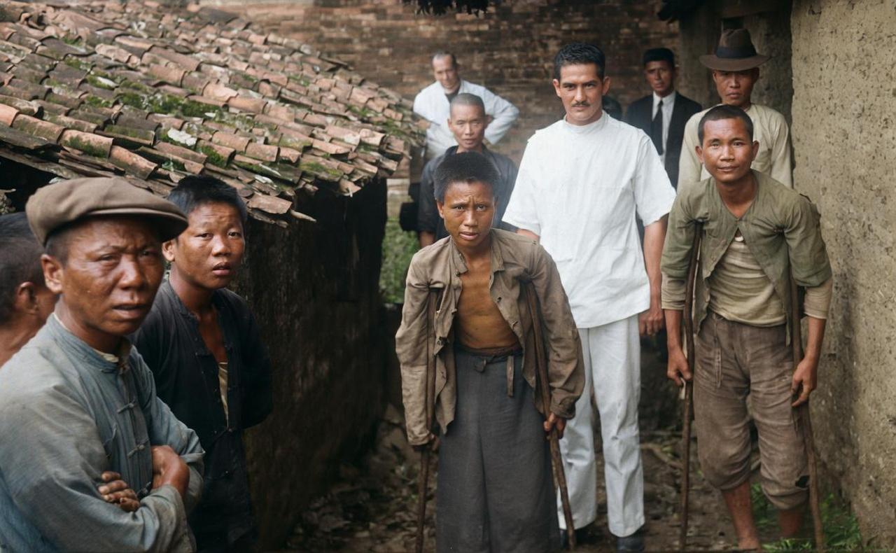 1935年,广东江门,身着干净白衣、留着利落八字胡的西方医生Blaber站在泥墙与青瓦之间,他是这座偏远麻风病院的医者,平静的目光落在身前的患者身上。 而他面前的几位中国患者,衣衫褴褛、面容枯槁,其中两人拄着拐杖,肢体的残疾是麻风病留下的残酷印记。他们的眼神里混杂着麻木、警惕与疲惫,仿佛早已习惯了被隔离、被遗忘的命运。 低矮潮湿的乡村民居,泥泞的地面、斑驳的泥墙和层层叠叠的青瓦,勾勒出华南乡间的贫瘠与闭塞。在那个年代,麻风病被视为“恶疾”,患者往往被驱逐出村落,集中安置在这样偏远的病院里,而像Blaber这样的西方传教士医生,正是早期中国麻风病防治的核心力量,在苦难与偏见中,为这些被抛弃的生命撑起了一点微弱的希望。