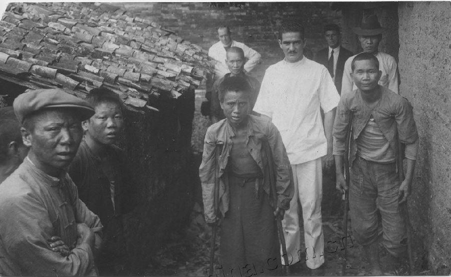 1935年,广东江门,身着干净白衣、留着利落八字胡的西方医生Blaber站在泥墙