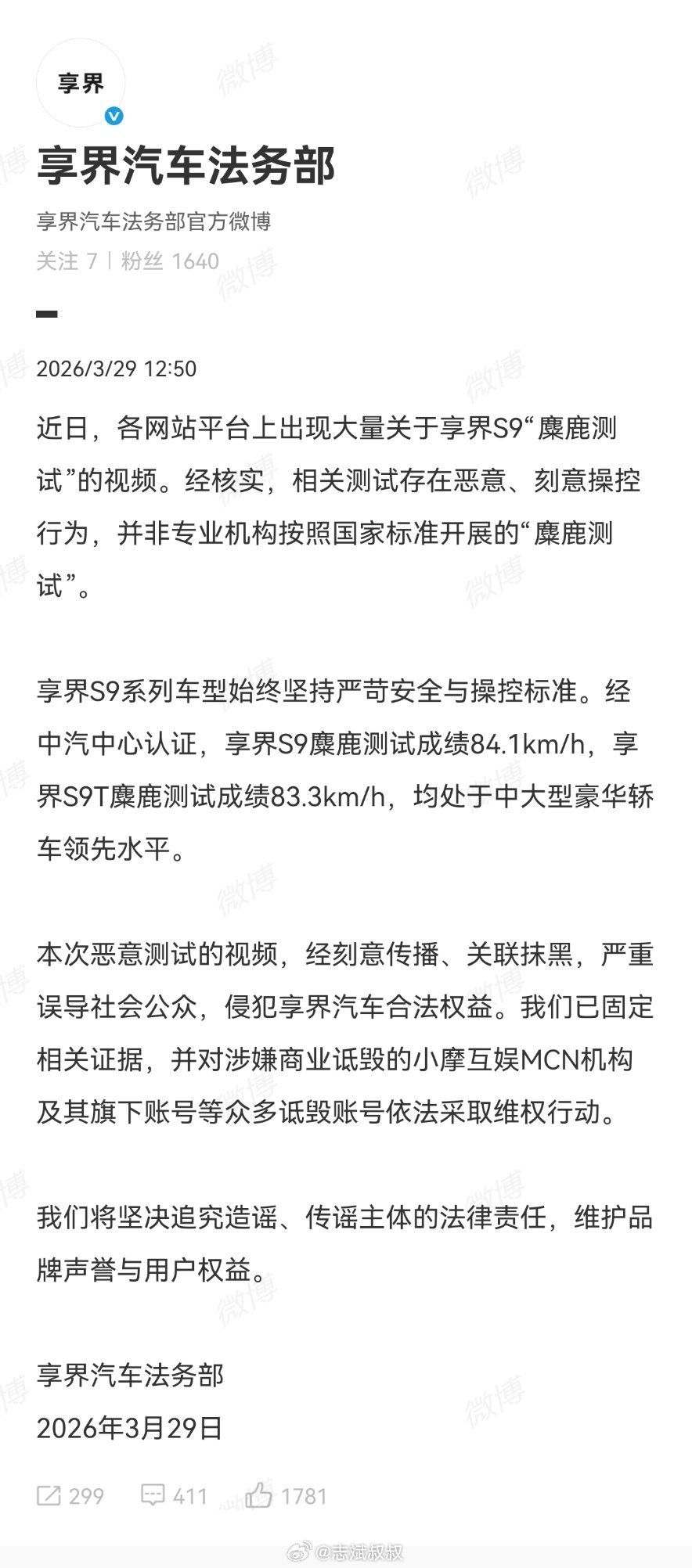 鸿蒙智行和享界是动真格了。坚决打击这种涉嫌商业诋毁和抹黑的行为。看来这家名叫小摩