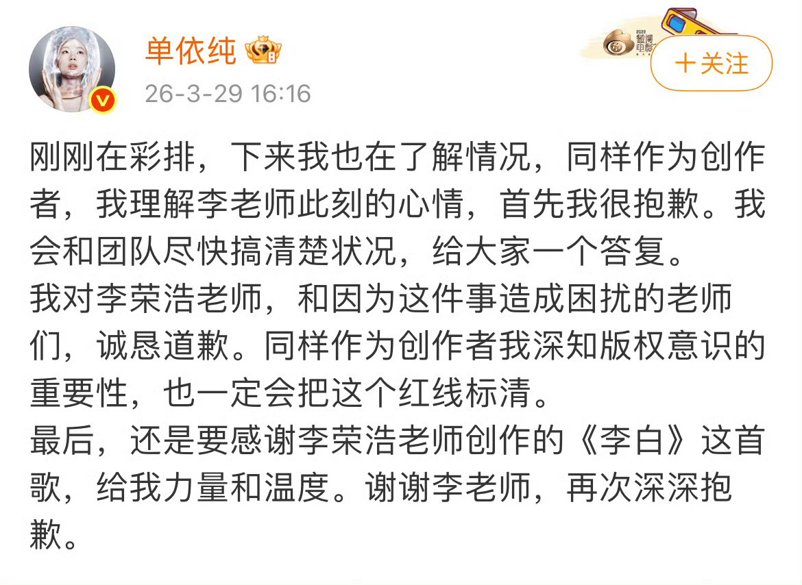 单依纯和李荣浩道歉李荣浩在微博发文指责单依纯强行侵权之后,单依纯发微博和李荣浩道