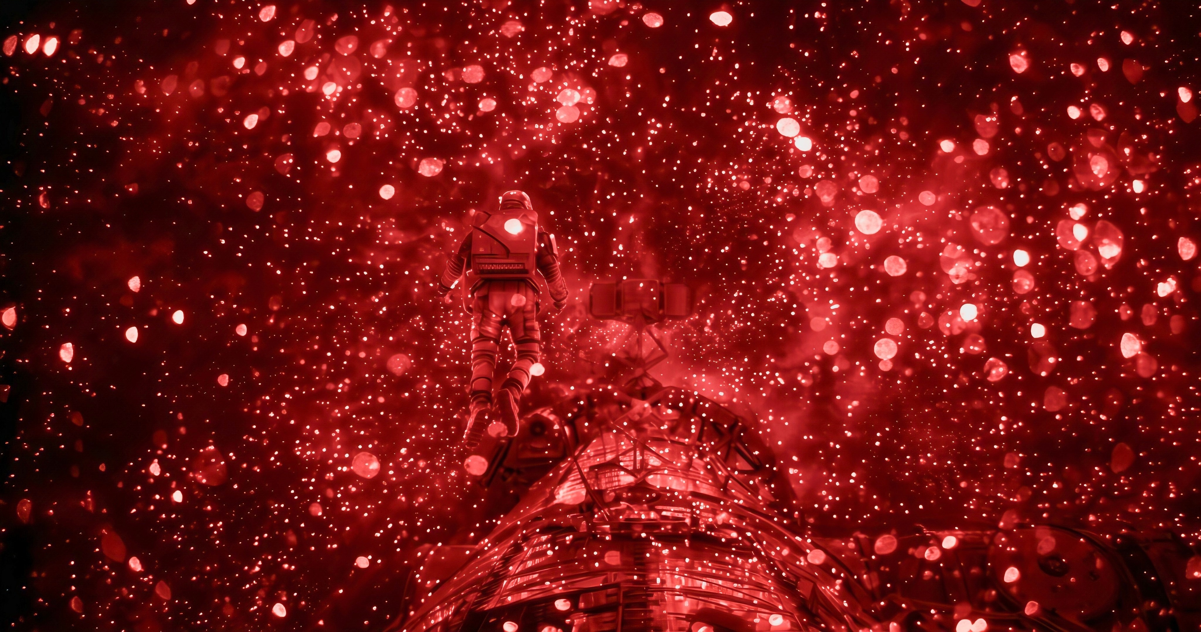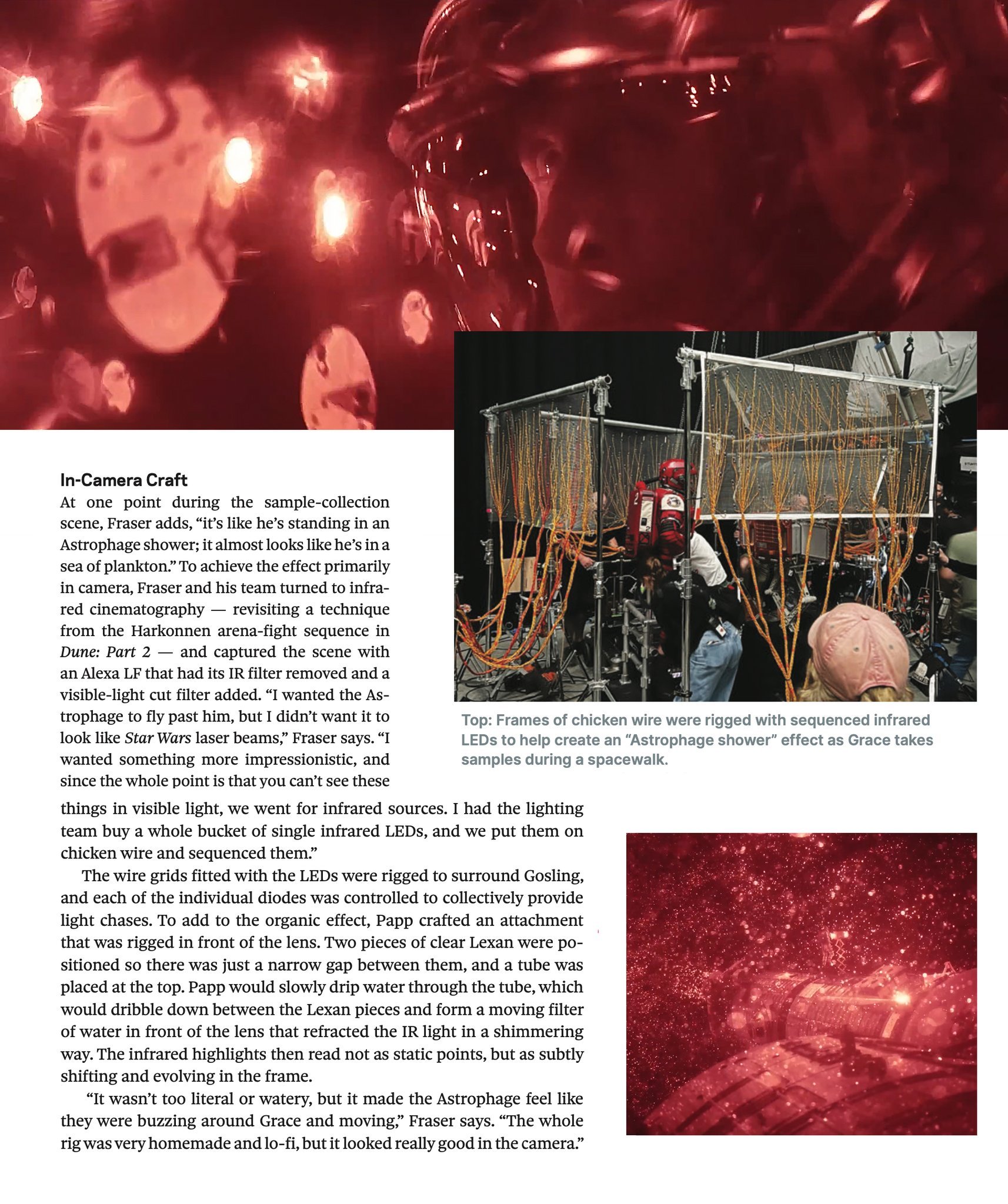 摄影师弗莱瑟使用了一台经过改装的阿莱Alexa LF摄影机,拆除了其红外滤镜(他在《沙丘2》和《猎杀本·拉登》中都使用过这项技术)。在铁丝网上放置了微型LED灯,同时在镜头前浇水,让水流折射光线。最后拍出了这个超绝画面!