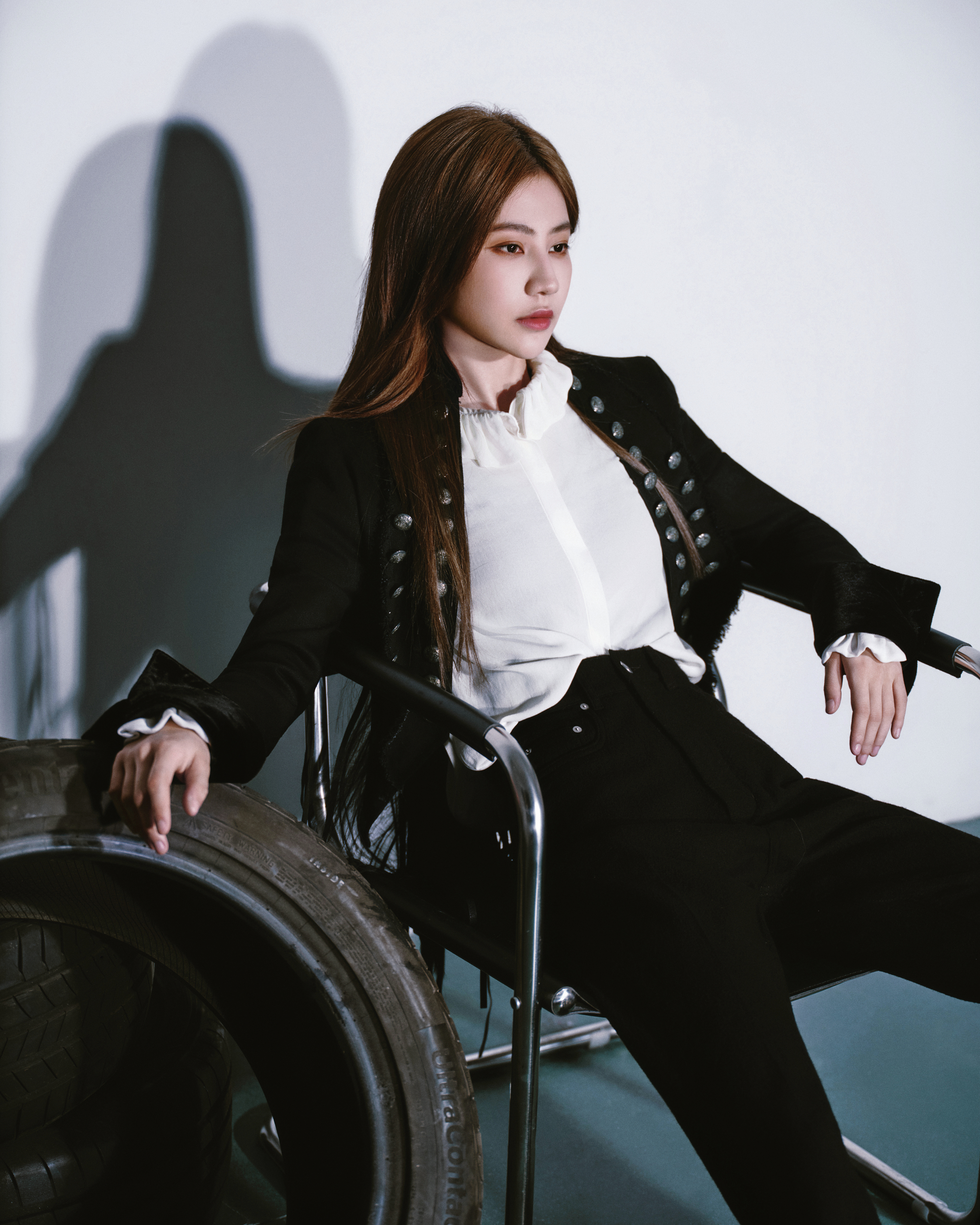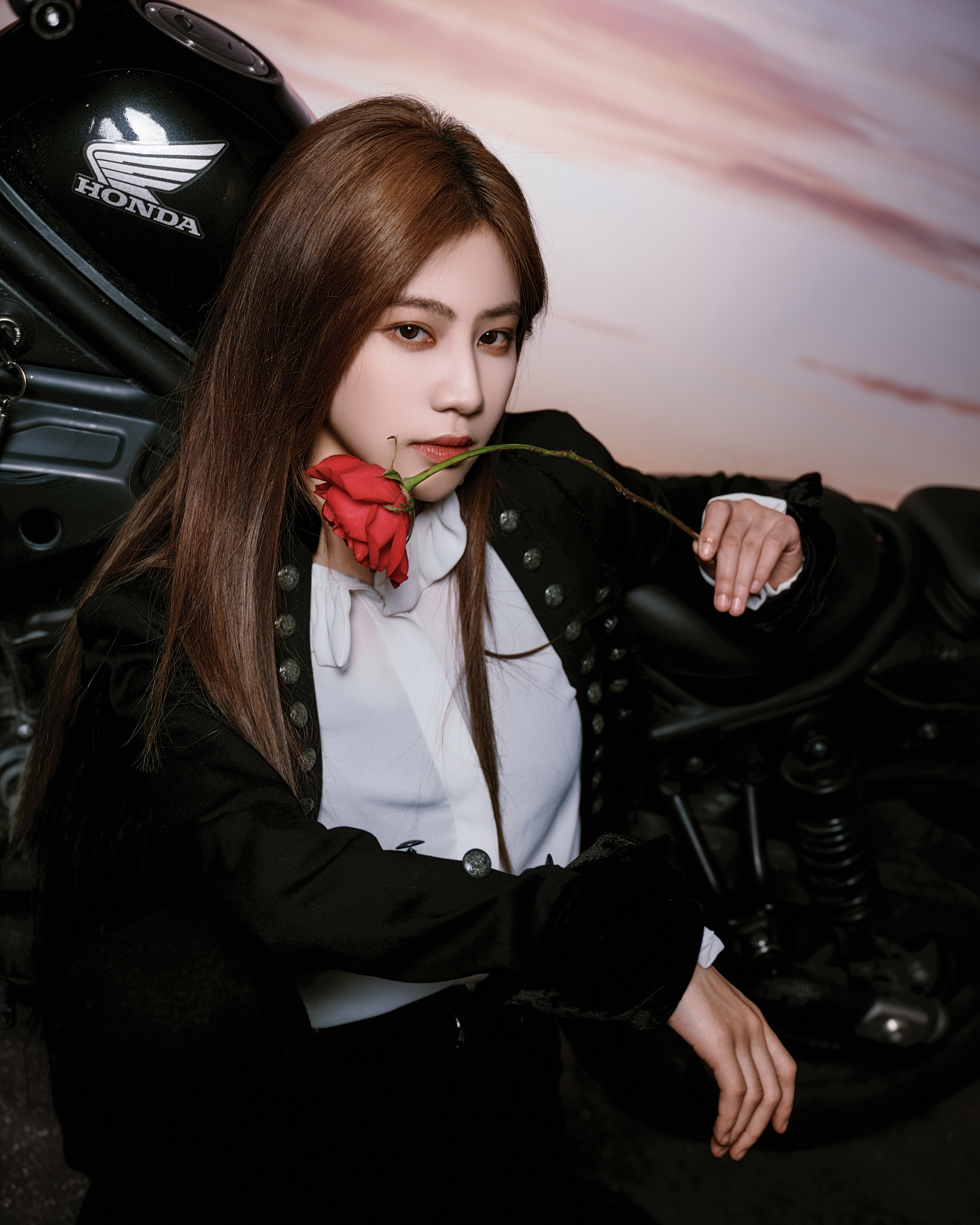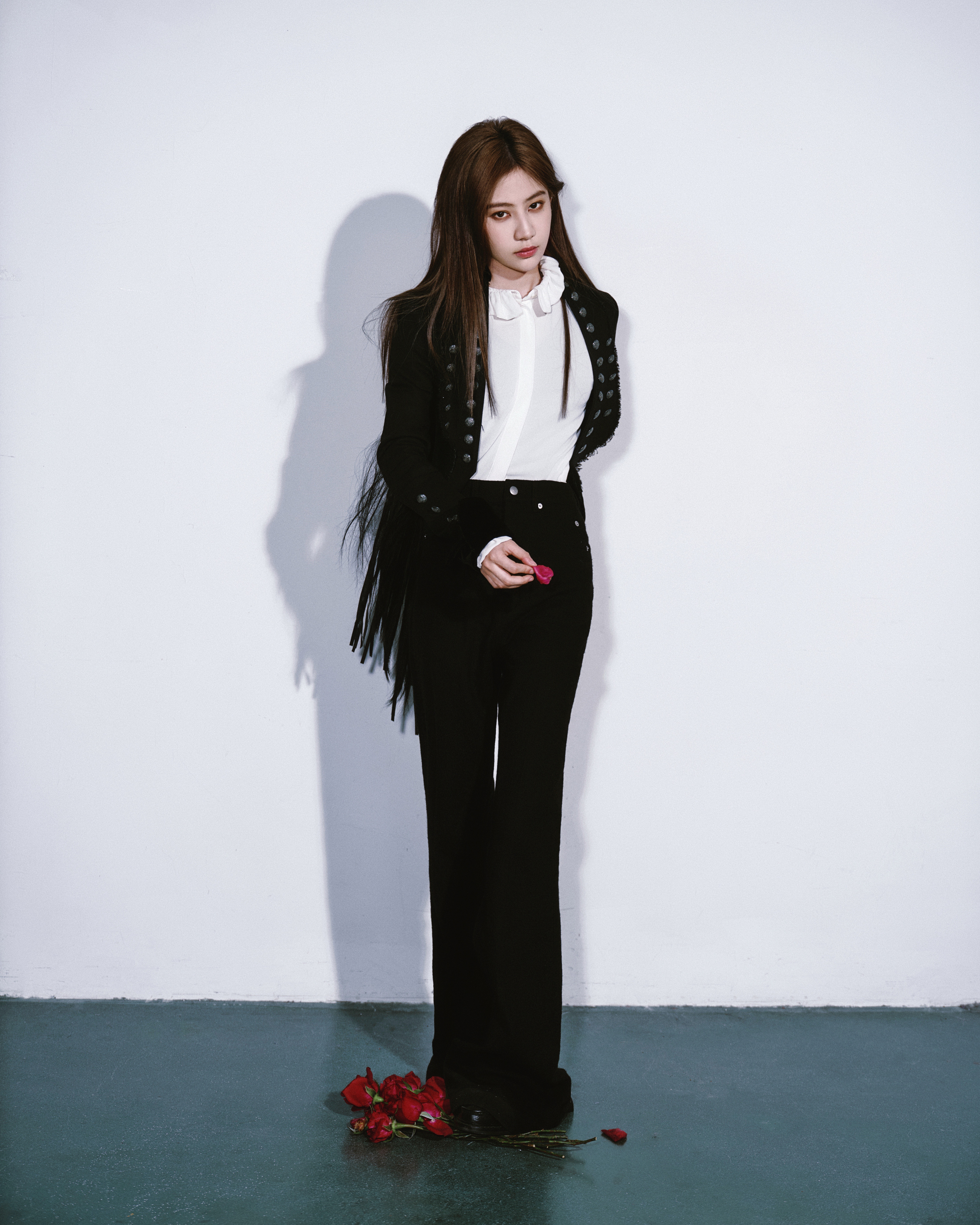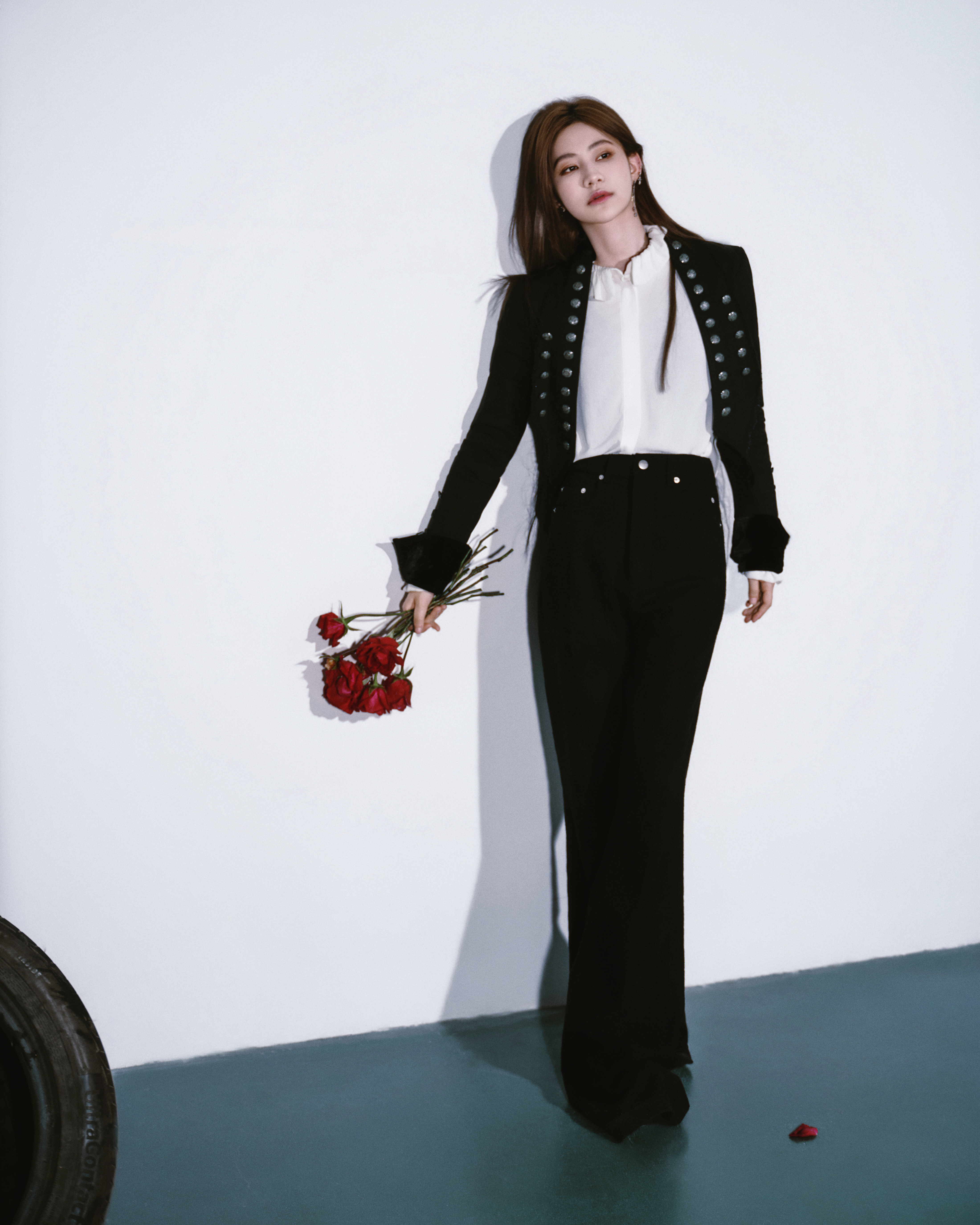 今日巅峰之夜造型 Look,一琦身穿宫廷骑士风西服套装出镜,经典黑白搭配,机车玫瑰,利落登场📸🥀