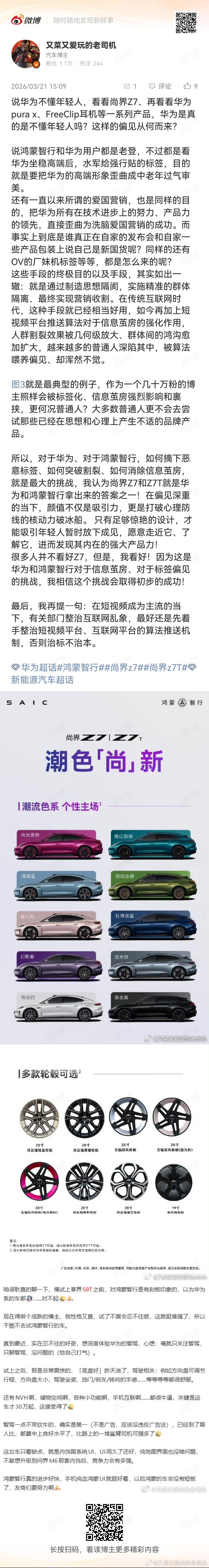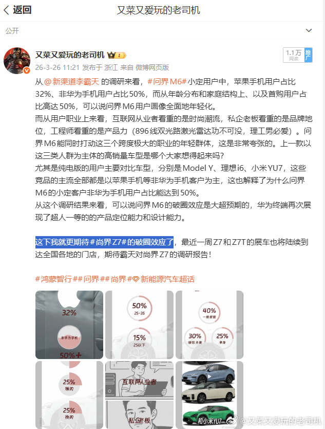 尚界Z7 和尚界Z7T 外观好看成为下定第一因素!事实再次证明了:华为就是可以比你更懂年轻人!不用不服气!的调研显示,尚界Z7 和尚界Z7T 的小定用户中,女性占比约4成、95后年轻人成核心客群,苹果手机用户占4成、非华为手机用户占一半!这也是为什么相比问界M6,我更乐观看好尚界Z7和尚界Z7T的破圈效应!我前些天说过:在信息茧房的约束下、在偏见深重的当下,颜值不仅是吸引力,更是打破心理防线的核动力破冰船。只有足够惊艳的设计,才能吸引年轻人暂时放下成见,愿意走近它、了解它,进而发现其内在的强大产品力!现在,我的预言已经初步成真了:调研中可以看到,在下定的原因中,外观好看超过896线激光雷达成为第一因素,这是鸿蒙智行有史以来的第一次!这样的破圈效应够不够?!