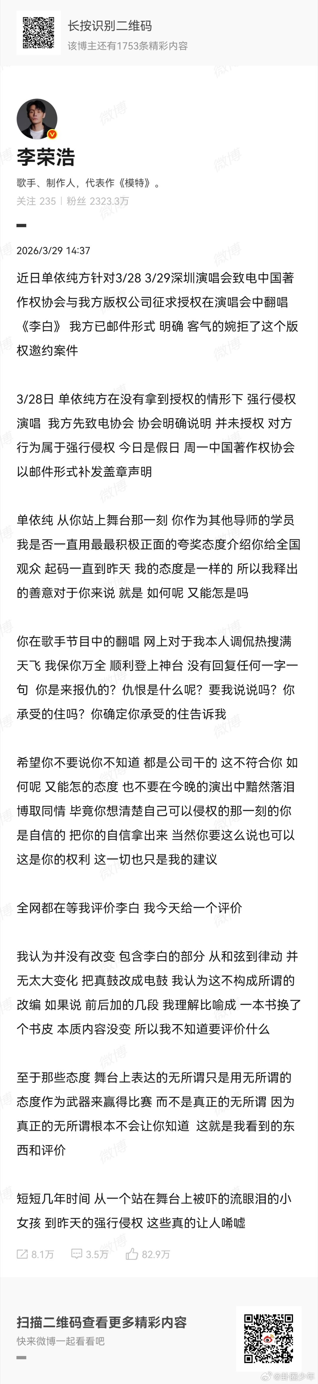 单依纯和李荣浩道歉单依纯就侵权相关争议在微博发文,向李荣浩表达歉意