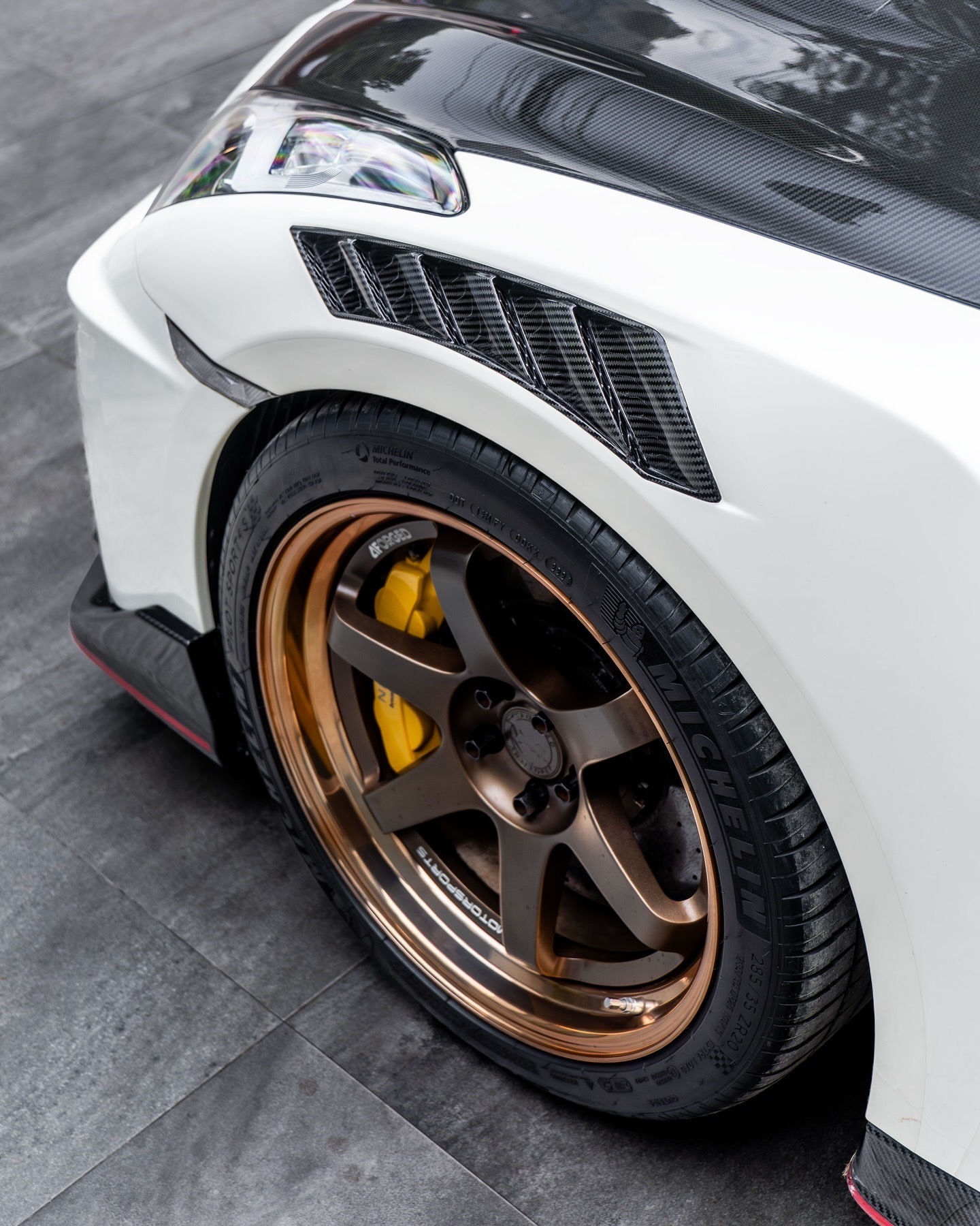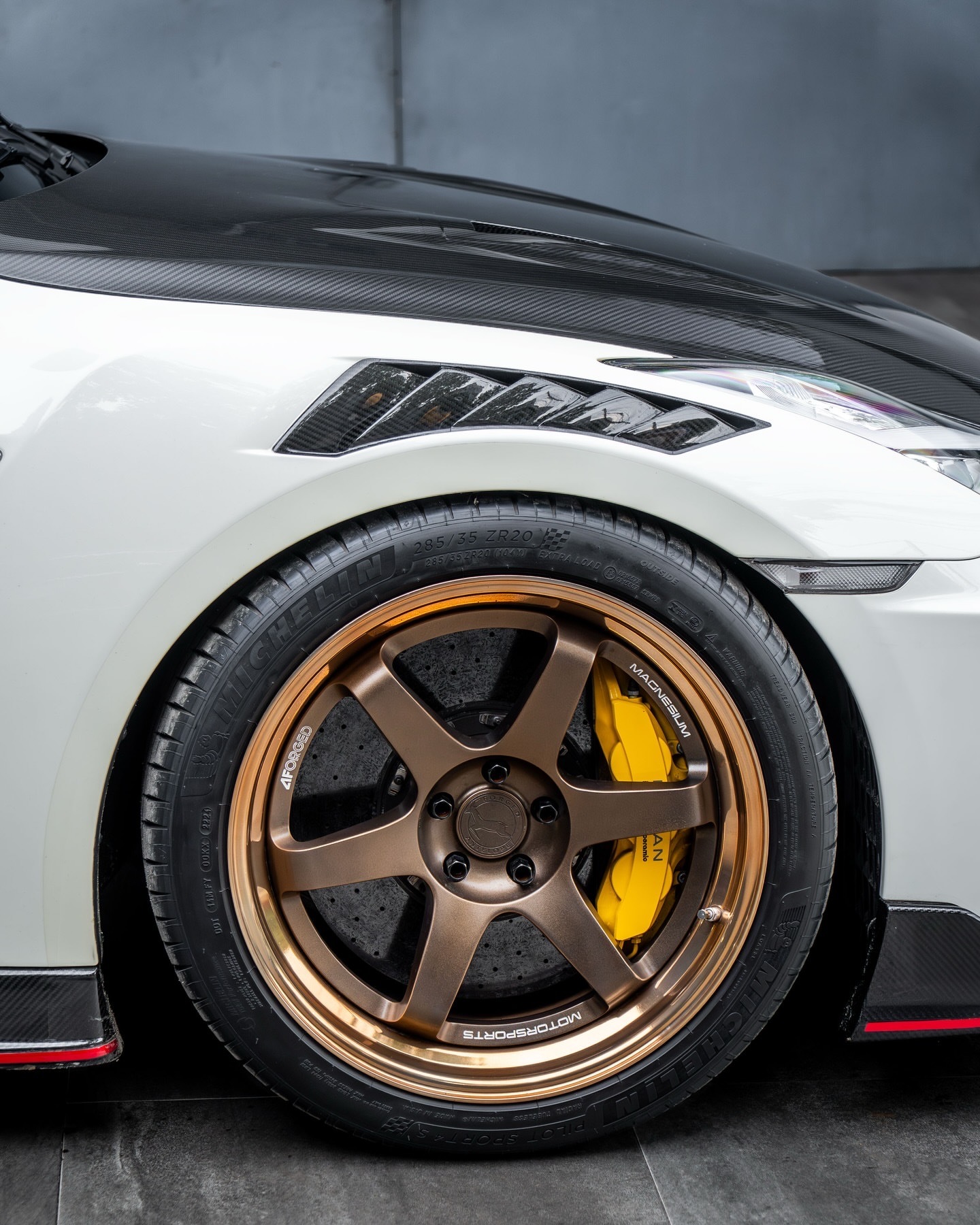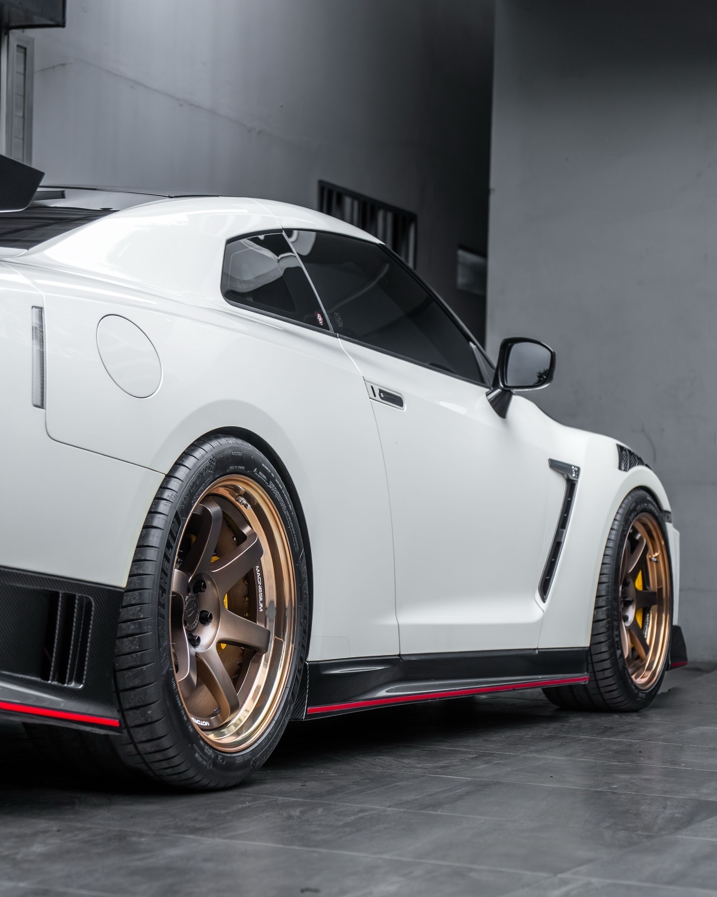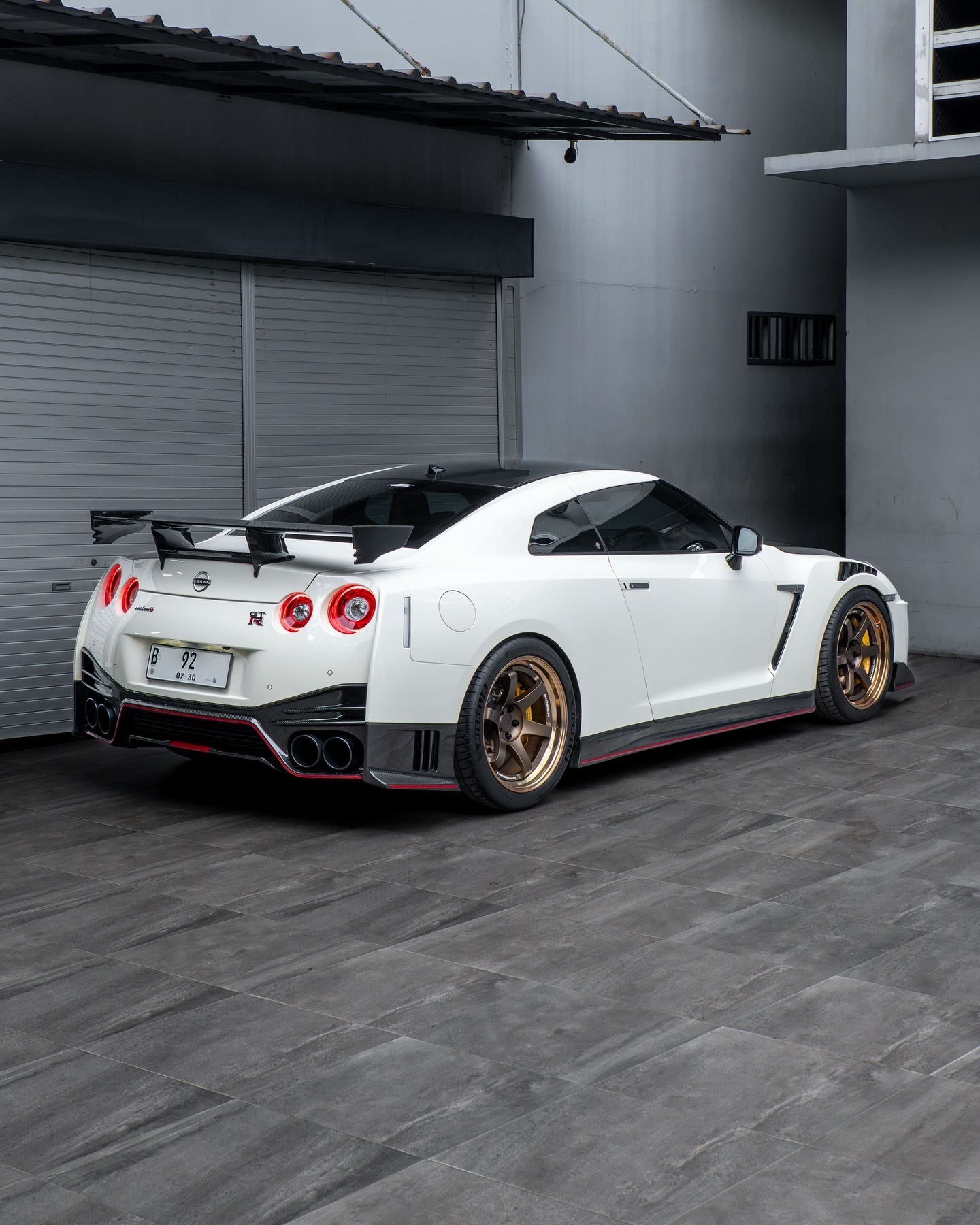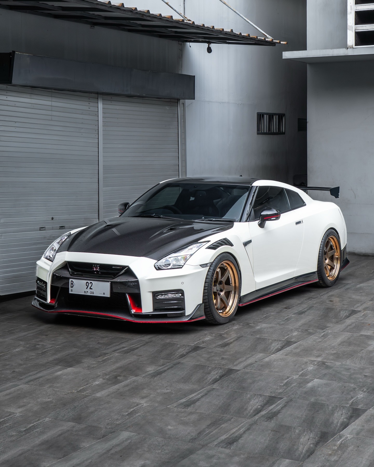 传承了传奇般的顶级设计,再加上极具雄性魅力的外观展现。这就是日产 GT-R Nismo。.这款 GT-R 系列中的顶级衍生车型,其重心完全放在了性能提升上。这一点不仅体现在引擎与操控层面,就连外观也经过了重新修订,以支撑其性能表现。.请看它的前保险杠设计,灵感源自他们赛车 GT-R Nismo GT3,包括通风口、侧裙、后保险杠直至尾翼。碳纤维材料广泛分布于车身外部的各个部分,无论是外露的还是隐藏在白色车漆之下的。.这一切都是为了增加空气动力学性能,并降低整车的重量。这辆被称为「哥斯拉」的座驾,因使用了高级车牌框而更加锦上添花。.为了更显帅气,这辆日产 GT-R Nismo 的车主舍弃了标准轮毂,换上了由 AForged 制造的 20 英寸三片式轮圈,前轮配以 285/35 规格的轮胎,后轮则选用 345/30 规格的轮胎。.日产gtr豪车超跑老纪侃车
