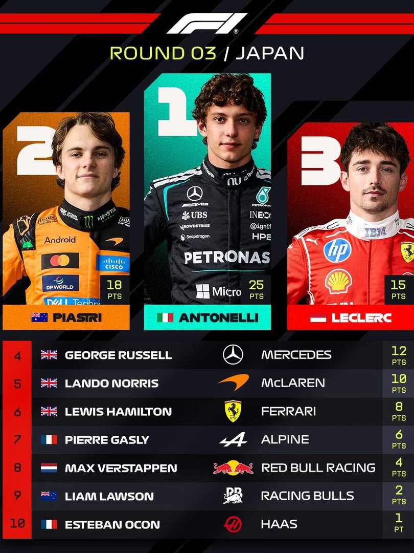 安东内利夺得F1日本站冠军最新战报:日本大奖赛正赛,前十名成绩!⭐️ 安东内利,25分。 19岁,成为F1史上最年轻的积分榜领跑者!拉塞尔仅落后队友4分维斯塔潘收获4分勒克拉尔再次登上颁奖台!