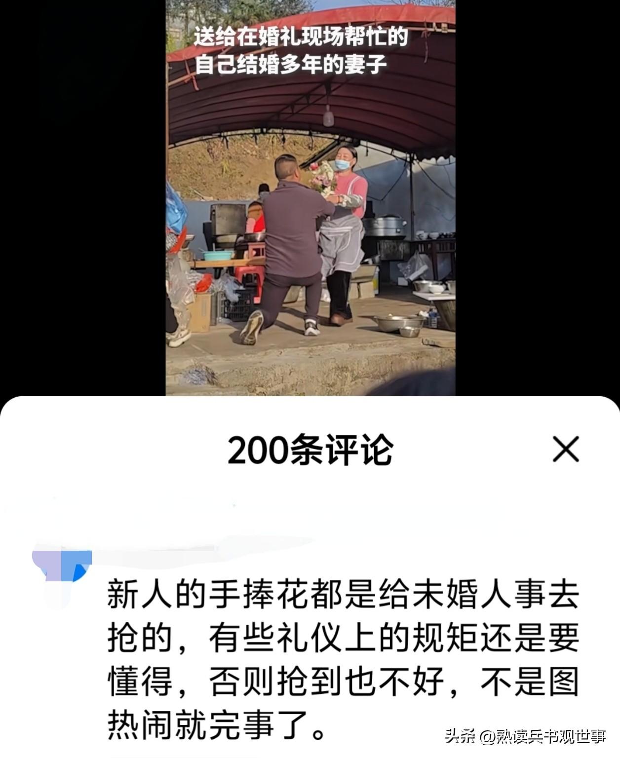抢新人鲜花的男子被批评不懂的规矩,我觉得倒无伤大雅。 事情也很简单,小两口结婚,然后新娘把她的手中花扔了出去,想要把这一份幸福传递下去,有没结婚的单身男女在抢,可突然之间杀出来一位已经结了婚的中年男子。 中年男子准备良久,他在新人扔第一把糖的时候没有动作,紧紧盯着新人手里的手捧花。事实证明,他的反应是最迅速的,他抢到了幸福之花。 而他接下来的动作是把花送给了在现场帮忙的妻子。虽然已是老夫老妻,但这种示爱的方式还是让人觉得心中一暖。 有的网友指出,新人的花应该是单身男女抢的,传递婚姻的美好。 个人觉得这花更代表着幸福,单身男女抢到了,去找寻自己的幸福,已婚人士抢到了,夯实自己的幸福。 不能因为是农村的,不能因为是结婚久了,就忽略了对另一方的示爱。 支持这位大哥的“挺身而出”,他的努力绝不会白费,他妻子收到这束花,一定会高兴很久很久。 毕竟,日子怎么可能跟谁过都一样呢?