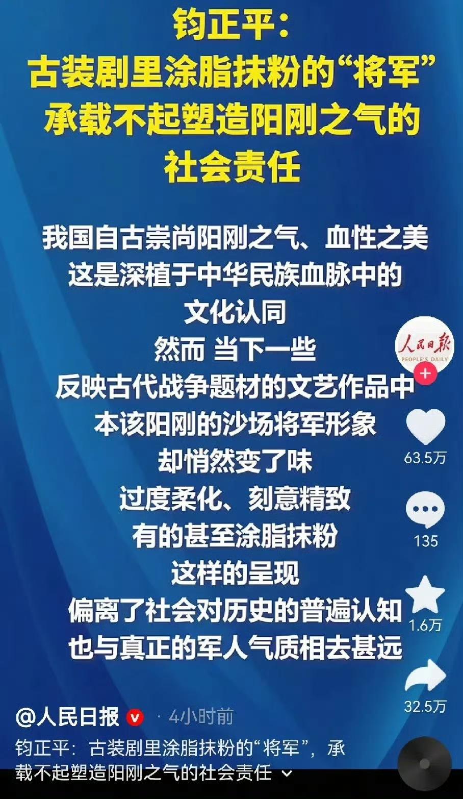 被官媒点名!《逐玉》踩中了古偶圈的雷区,“将军”不该只剩精致滤镜 古装剧里的“将军”形象,这次真的被戳破了! 由张凌赫主演的《逐玉》,刚开播就撞上了舆论枪口。剧中他饰演的“浴血战神”武安侯,全程妆容精致到“焊死”,肤白无瑕、发型纹丝不乱,连战损都像摆拍,被网友调侃成“粉底液将军”。而就在此时,钧正平发文直指当下古偶乱象:本该阳刚的沙场将军,被过度柔化、刻意精致,甚至涂脂抹粉,完全背离了军人的血性与担当。人民日报等官媒随后转发,直接将争议推向高潮。 这波点名看似针对《逐玉》,实则戳中了近年古偶圈的通病: - 将军题材成了流量“颜值秀场”,为了迎合审美,连武将的底色都丢了; - 为了精致感牺牲真实,金戈铁马变成摆拍,连打仗都像走秀; - 价值观向颜值观妥协,最后只剩一副空洞皮囊,完全消解了阳刚之气。 一部剧的翻车,也给整个行业敲了警钟:将军可以帅,但不能丢了骨子里的筋骨与血性。真正的英雄形象,从来不是靠粉底和发型撑起来的。