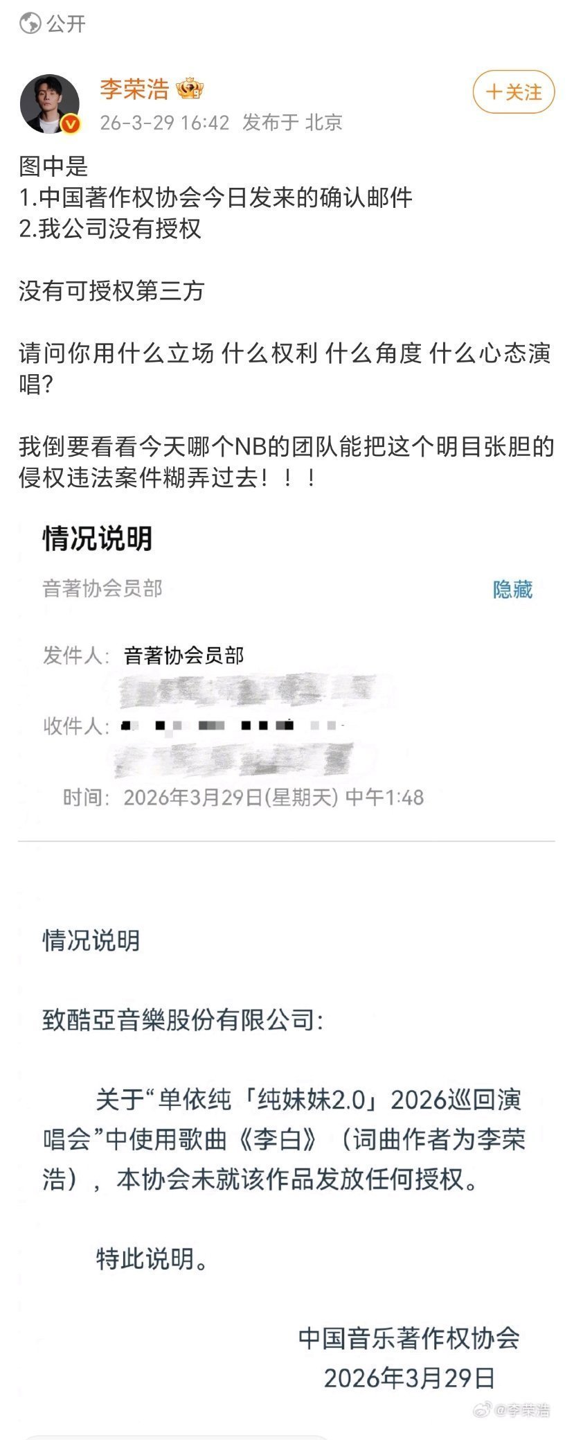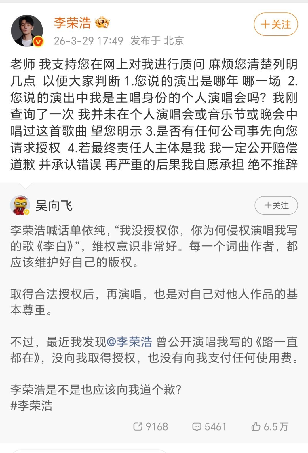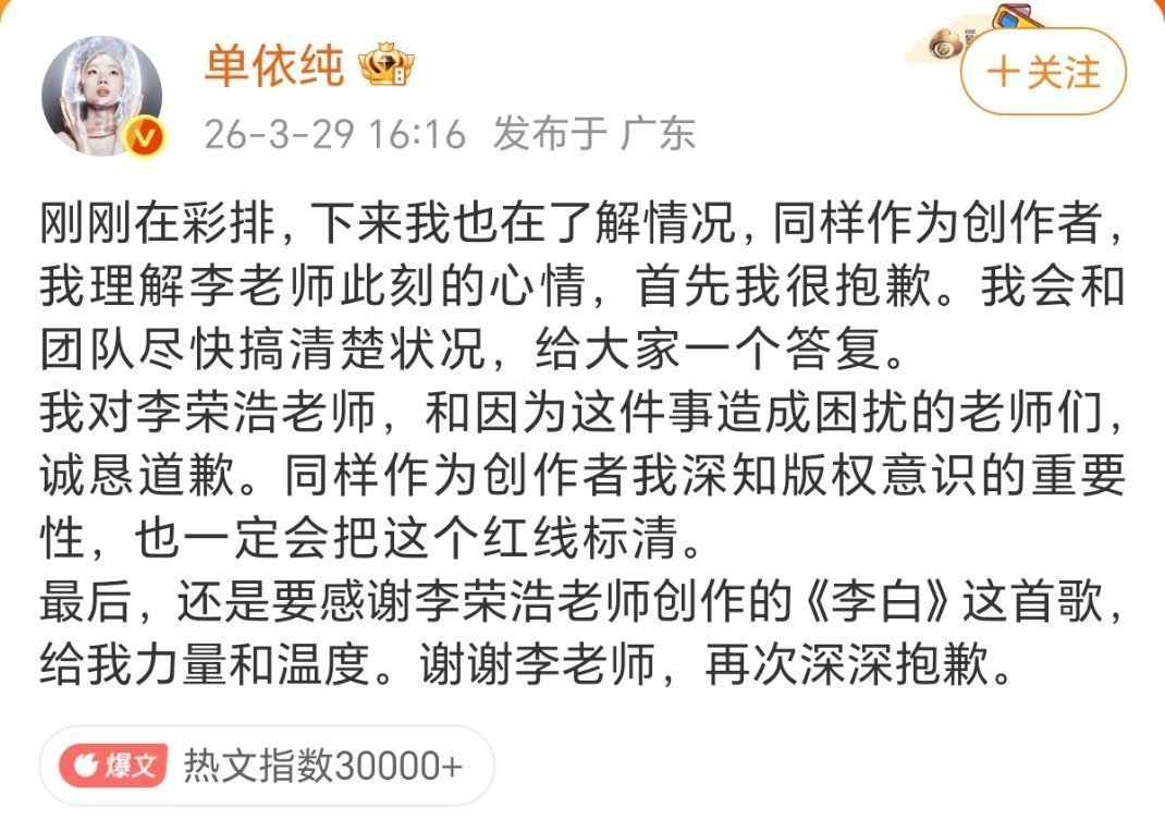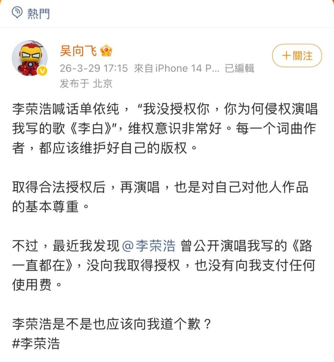 好喜欢看糊坛这样亲自下场刚的热闹李荣浩是堵死了单依纯辩解的各种理由 啊啊吴向飞出来说李荣浩无授权唱他的歌还没给钱 李荣浩已正面回应