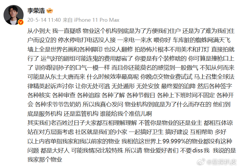 李荣浩上一次发长文还是在吐槽物业李荣浩连用三个感叹号看得出来李荣浩真的很生气,把