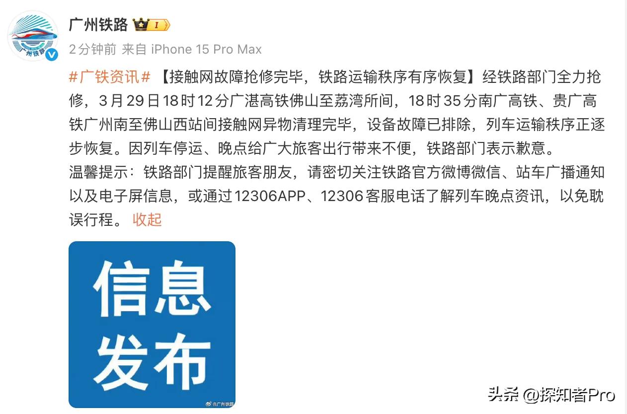 孩子别哭,这世界不缺乏爱 孩子别哭,天公不作美,掐断了光和电,人间给你光和电,给你美好的世界... 今天(3月29日)下午,广州铁路桂林北至珠海方向的D3665列车因天气原因,不得不被卡在佛山至广州南站之间的一条隧道中停水停电,等待抢修救援。 此时,黑暗充斥着整个列车,温度不断飙升,时长维持长达2个多小时。天公好不作美! 而在这期间,工作人员的工作态度也如广州的温度,给足了乘客温暖热情——为了乘客安全,满头大汗奔前走后,一边要安抚乘客情绪,一边还要时刻了解列车道路动态,给乘客合理解释,也是好不容易! 成年人还好说,可小朋友却顾不了那么多,他们只知道冷热哭笑,管不得你那么多,断电黑暗的列车温度一路飙升,车厢又黑又热,有些小朋友受不了黑和热,哭闹不止... 此刻,温暖大爱的一幕出现了,所有乘客不约而同把手机手电筒打开,为小朋友照亮车厢,给小朋友安慰,给小朋友光... 或许,这是人间最温柔的光,是人间最适合的温度,天公不作美,人间给你美,天公给你黑暗,人间给你光明... 但愿人间永远没有黑暗,充满了光和温暖,照亮你我他的人生旅程! (消息来源: 南方都市报、广州铁路、极目新闻)