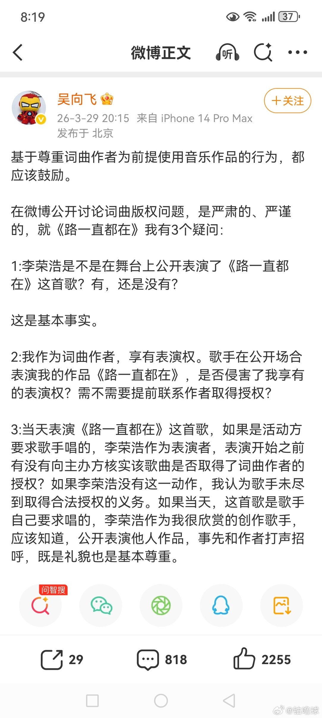 吴向飞又发文了,发了好像又没发,李荣浩提的问题一个没回答,又自问自答的说了一通,
