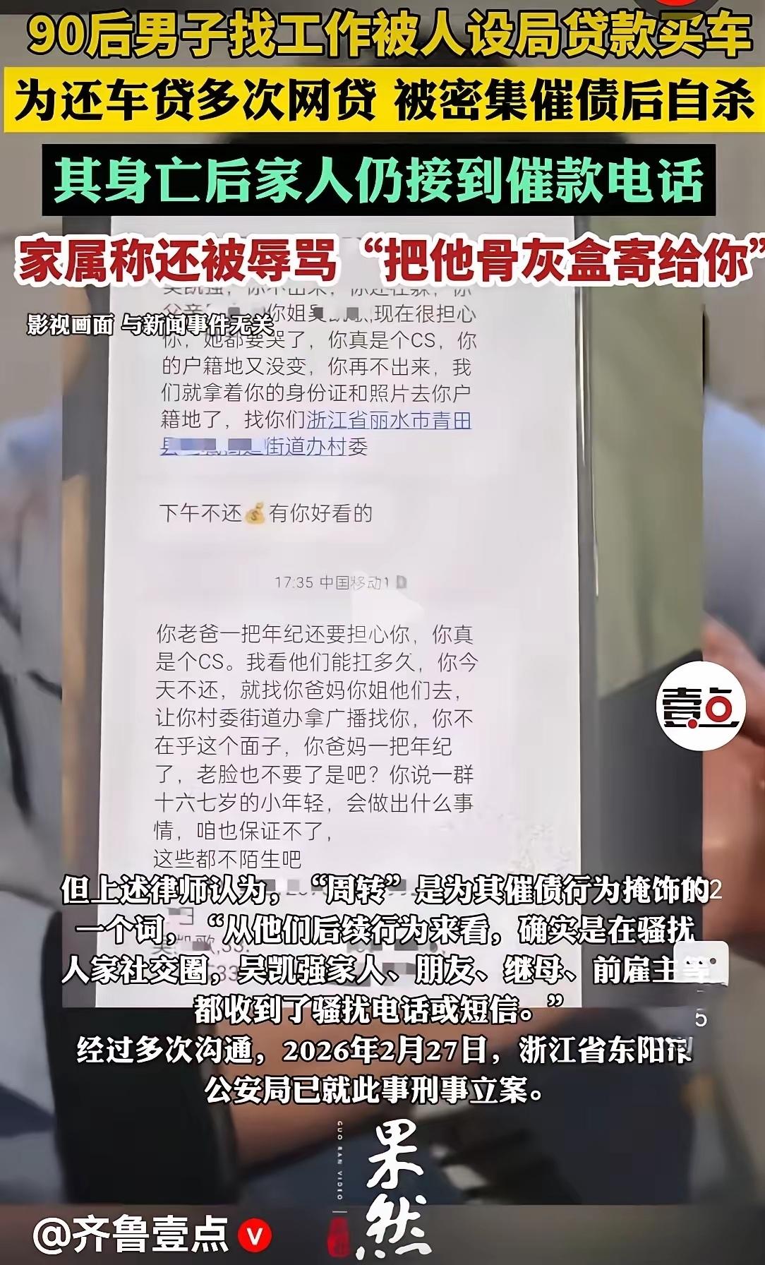 “把他骨灰盒寄给你!”浙江男子轻信“月入过万”司机工作,被骗贷19万后自杀,死后还被催收辱骂! 大家好,今天要说一个看完让人浑身发冷、气得发抖的真实案件。 浙江东阳,33岁的吴凯强,在母亲长眠的公墓旁,在车里结束了自己的生命。 悲剧的起点,是一则招聘广告:保底月薪1.2万,公司配车不用押金。 他信了。 结果对方拉着他签了买车合同,他名下多了一辆14万的车,背上19万贷款,每月要还3194元。承诺的高薪工作?根本没有。那辆车保险单上写着“非营业”,连跑网约车都违法。 他拼命接顺风车,运气好一个月赚4000,差的时候不到1000。不够还贷就借网贷,利息像滚雪球一样越滚越大。催收电话从早到晚响个不停,不仅打给他,还打给他家人、朋友、前雇主、甚至继母。 2025年10月19日,网贷逾期第一天,催收用支付宝转0.01元留言挑衅:“看看你能躲多久”。 那天,他在浏览器搜了80多条关于“死亡方式”的内容。然后买农药,把车停在母亲公墓旁。最后一封邮件写道:“对不起,我扛不住了……我不想死,真的不想。” 更让人愤怒的是:他死后5天,催收电话还没停。有人用方言打电话辱骂他姐姐:“把他骨灰盒寄给你”。催收短信里还发了他们一家人的身份证号,威胁说“一群十六七岁的小年轻,会做出什么事,咱也保证不了”。 今天咱们就来拆解一下,这起悲剧背后,法律到底该怎么管。 一、招聘者“高薪为饵、骗人买车”,法律怎么说? 很多人可能会问:合同是自己签的,贷款是本人办的,能怪别人吗? 这里有一个关键概念:隐瞒重要事实诱导签约,中介方要承担赔偿责任。 根据 《民法典》第962条,中介人应当就订立合同的重要事项向委托人如实报告。故意隐瞒重要事实或者提供虚假情况,损害委托人利益的,不得请求支付报酬,还应当承担赔偿责任。 本案中,招聘者从头到尾不提工作细节,只拉着他看车、签合同,全程不让细看条款。承诺的“月入过万”工作压根不存在,所谓的“公司配车”实际是让他自己贷款买车。这属于典型的故意隐瞒重要事实。 所以,招聘者不仅无权收取任何费用,还要对吴凯强的经济损失承担赔偿责任。虽然人已经不在了,但他的家属可以依法提起诉讼,要求对方赔偿购车款、贷款利息、精神损害等。 这不是“自己签的合同自己负责”,而是“你骗我签的合同,你要负责”。 二、暴力催收逼死人命,已经不是“催债”是犯罪 很多人以为,欠债还钱天经地义,催收手段狠一点也就是“不道德”。 错了。 根据 《刑法修正案(十一)》 ,使用恐吓、骚扰、泄露隐私等手段催收非法债务,情节严重的,构成催收非法债务罪,最高可判三年有期徒刑。 本案中催收人员的行为,已经远远超出“狠一点”的范畴: · 频繁拨打吴凯强及其亲友电话,不分昼夜 · 用支付宝转0.01元留言挑衅 · 死后5天继续打电话辱骂家属 · 将吴凯强、姐姐、父亲的身份证号发到催收短信里 · 威胁“一群十六七岁的小年轻会做出什么事” 这些行为,每一项都踩在了法律的红线上。而最终导致吴凯强精神崩溃自杀,属于情节特别严重。 目前当地警方已刑事立案。等待这些催收人员的,将是刑事责任——不是赔钱了事,是要坐牢的。 三、家人被骚扰,法律怎么保护?这几点要记住 吴凯强死后,他的家人还在承受催收的骚扰。很多人遇到这种情况,第一反应是忍气吞声,觉得“欠债理亏”。 请记住:暴力催收是违法行为,不管欠没欠钱,催收都不能违法。 如果你或你的家人遇到类似情况,可以这样做: 第一,保留证据。 通话录音、短信截图、微信聊天记录、支付宝转账留言,全部保存。这些是报警和起诉的关键证据。 第二,报警。 根据《治安管理处罚法》,骚扰他人、威胁人身安全的行为,警方应当受理。吴凯强的家人一开始报案被说“证据不足”,后来律师介入、提交遗书等证据,警方最终刑事立案。这说明:证据越充分,警方越容易立案。 第三,向银保监会投诉。 正规金融机构的催收行为受严格监管,暴力催收可以向银保监会12378热线投诉,相关机构会被处罚甚至吊销资质。 第四,起诉催收公司。 泄露隐私、名誉损害、精神损害,都可以通过民事诉讼要求赔偿。 结论:一个人被逼到去死,不是他太脆弱,是这张网太密 有人说:他为什么不报警?为什么不跟家里说? 说实话,一个被催收电话从早到晚轰炸、社交圈被搅得天翻地覆、每天活在恐惧里的人,他的判断力、行动力已经被一点点蚕食殆尽了。他不是不想逃,是不知道怎么逃。 最后问大伙一句:你觉得在这起案件中,招聘平台、贷款机构、催收公司,谁的责任最大? 评论区说说你的看法。