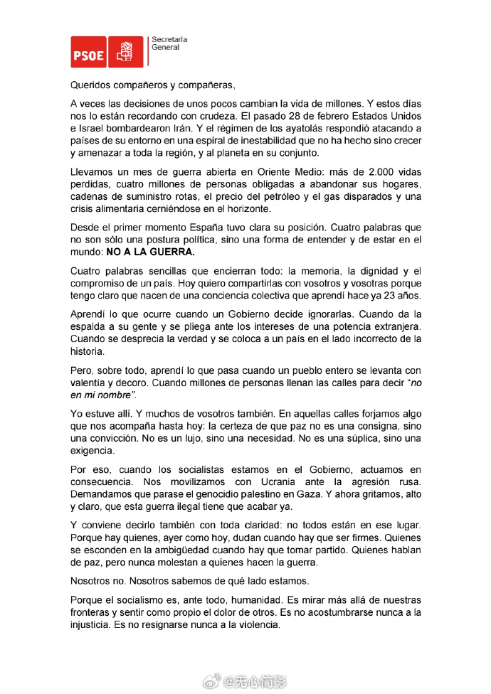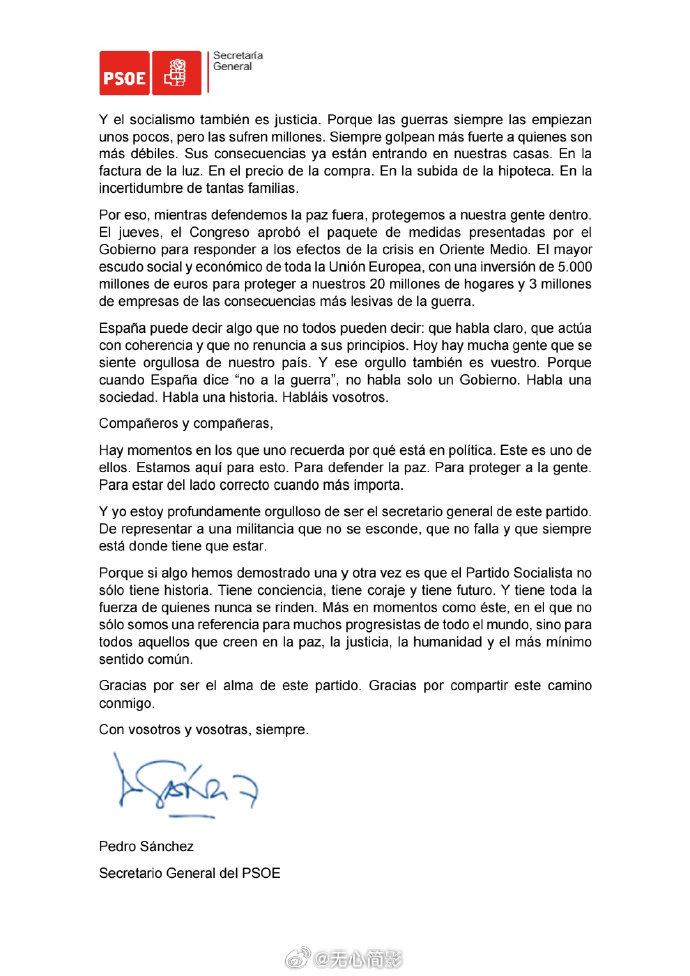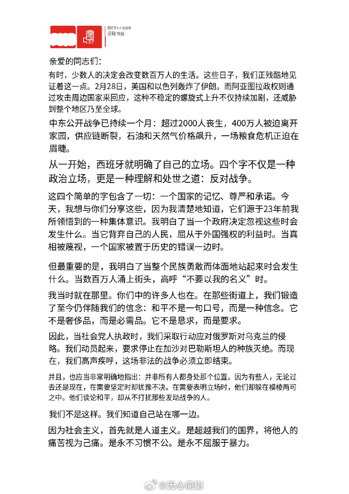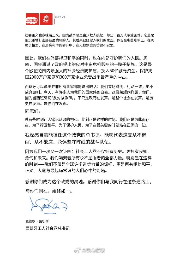 西班牙执政党—工人社会党今天在官方帐号上发表的反战声明,首相桑切斯也转发了,声明