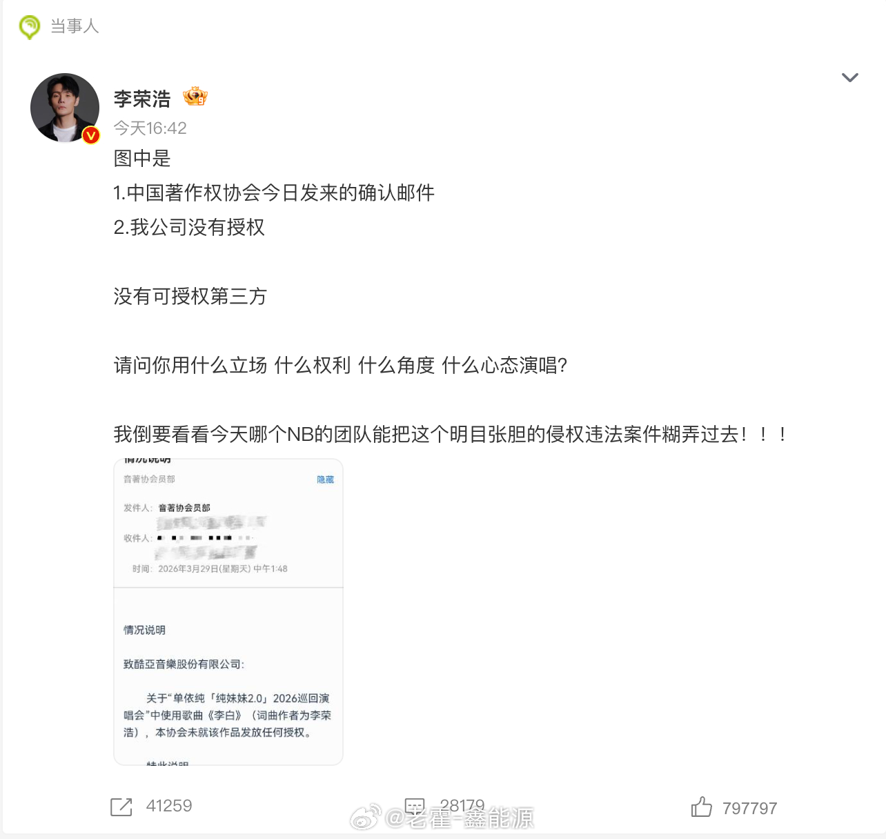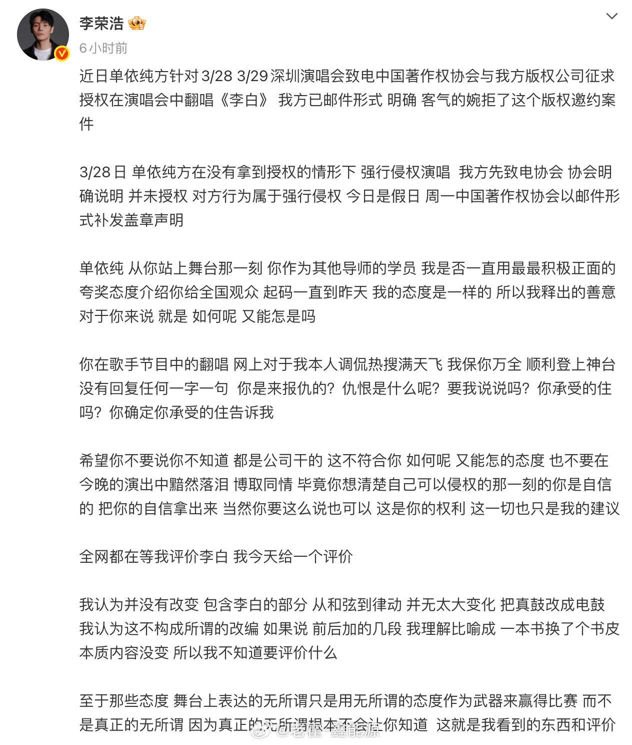 目前来看,李荣浩已经在微博中写的已经很全面了,其实这当中有一个很重要的一点,在于“商业演出”,而演唱会是最明显,最公开的一种商业演出。其他地方你演唱,可能认定商业演出什么的还比较麻烦,但是演唱会,那就很明显了。