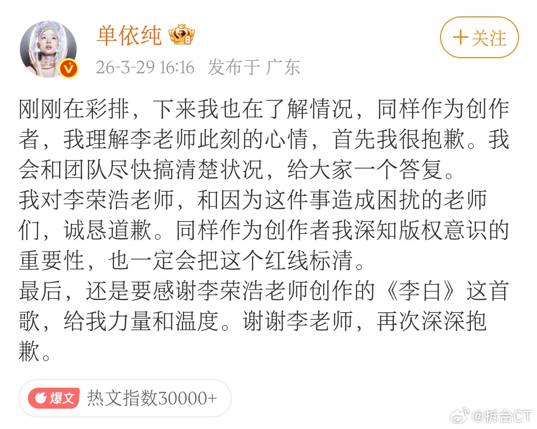 为今之计,单依纯的公关最好是抓紧跟李荣浩团队建联,诚恳认错的同时,提出适当的补偿措施。