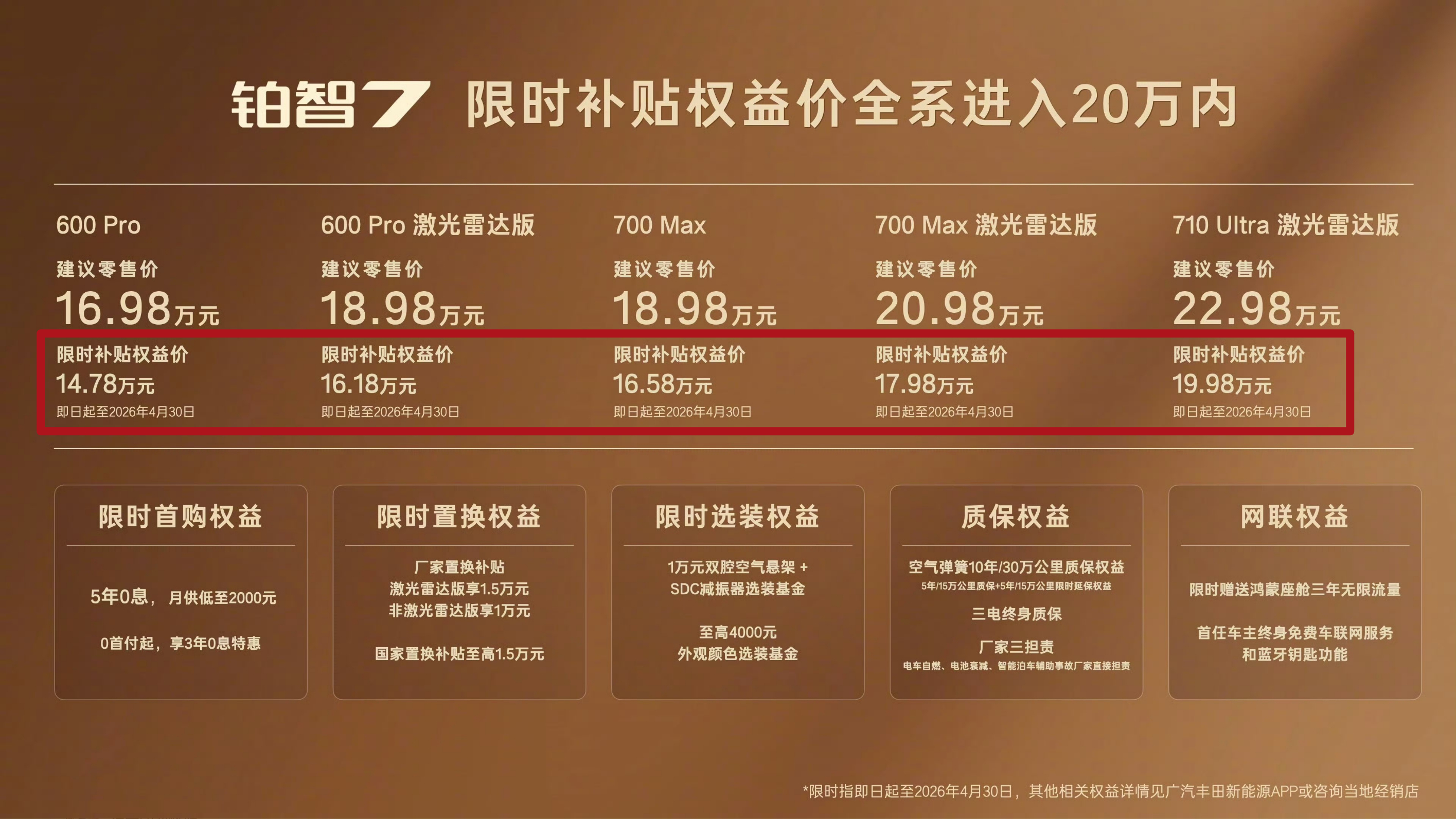 铂智7上市限时补贴权益价14.78万起霸天资讯 丰田铂智7限时补贴权益全系20万内