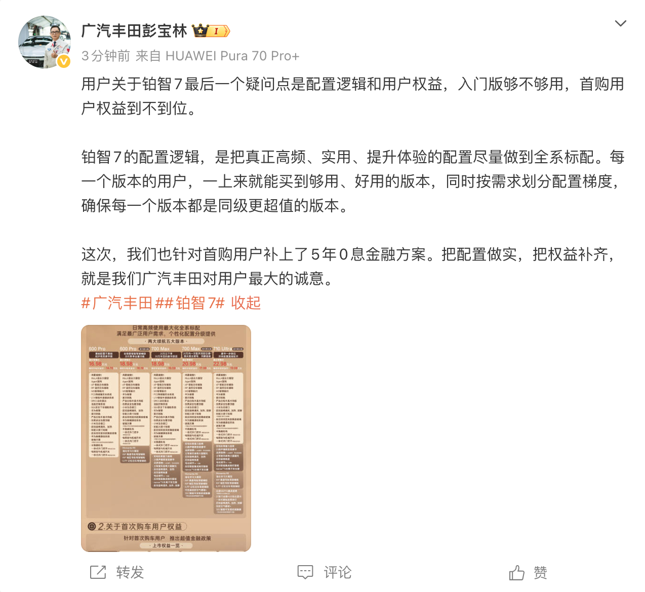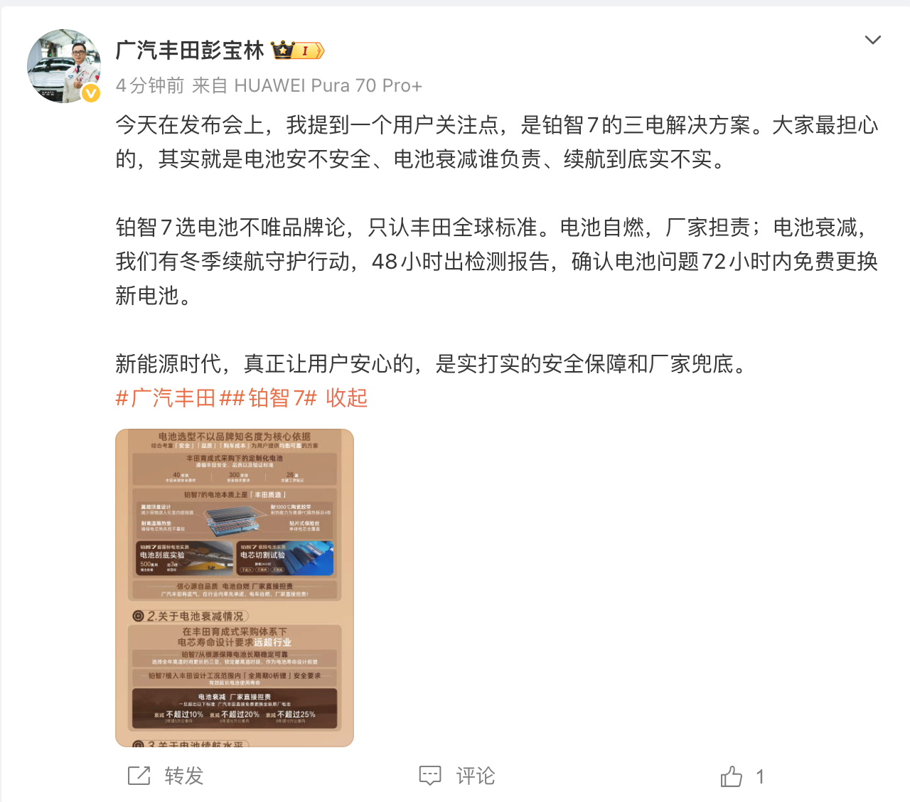 广丰高管回应铂智7四大关切聊聊长期持有这件事。我身边买电车的朋友,开一两年都说香,但问到要不要开个五六年,就开始含糊了——怕电池衰减、怕空悬坏了修不起、怕厂家到时候不认账。