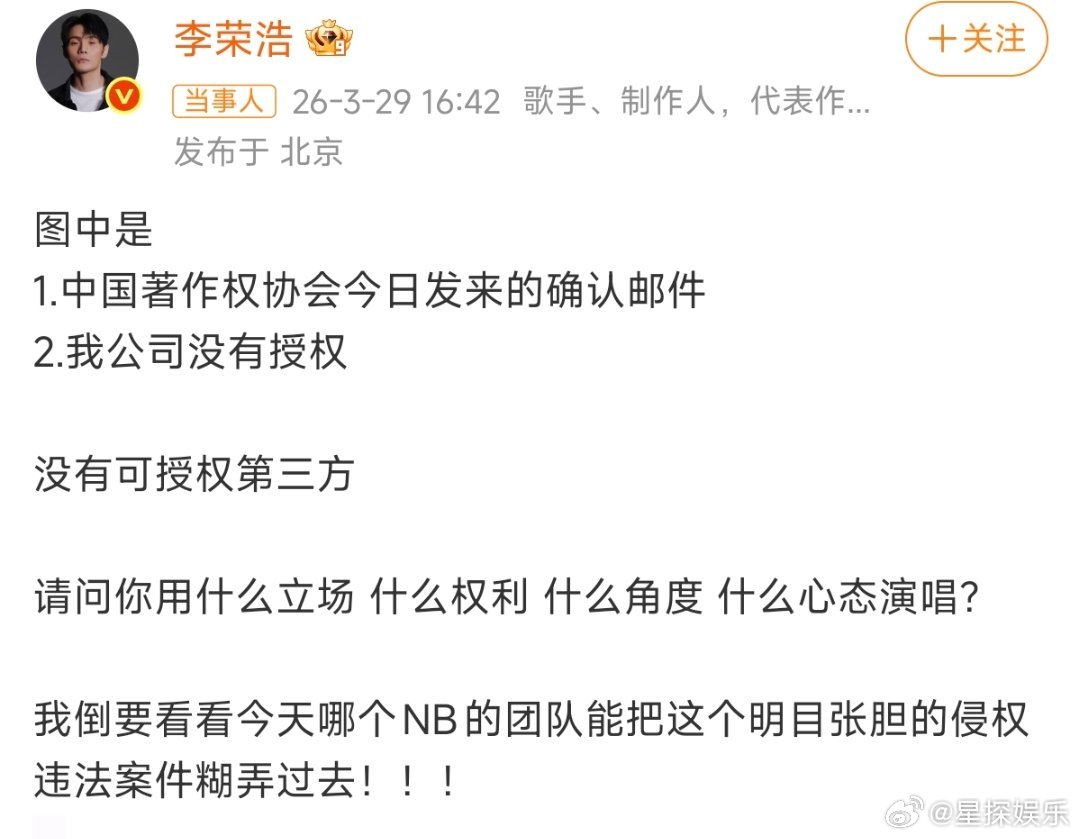 李荣浩4连质问单依纯李荣浩这次真的刚,直接把音著协的文件甩出来,连番质问也没给半点模糊空间。明明之前就被婉拒授权,演唱会还硬唱《李白》,换谁都忍不了。原创的底气,从来都不是靠人情撑起来的。