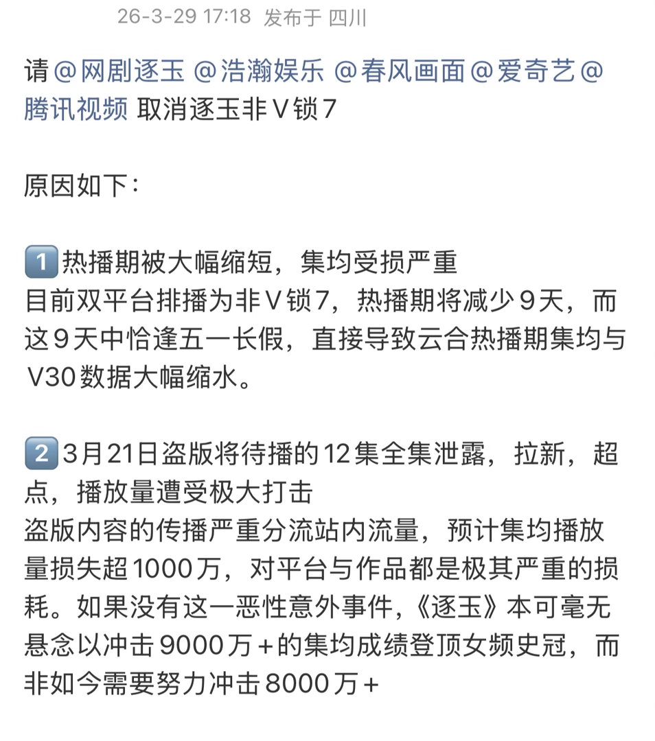 张凌赫粉丝提出诉求:要求平台和剧方取消逐玉非V锁7,并给出5大理由。
