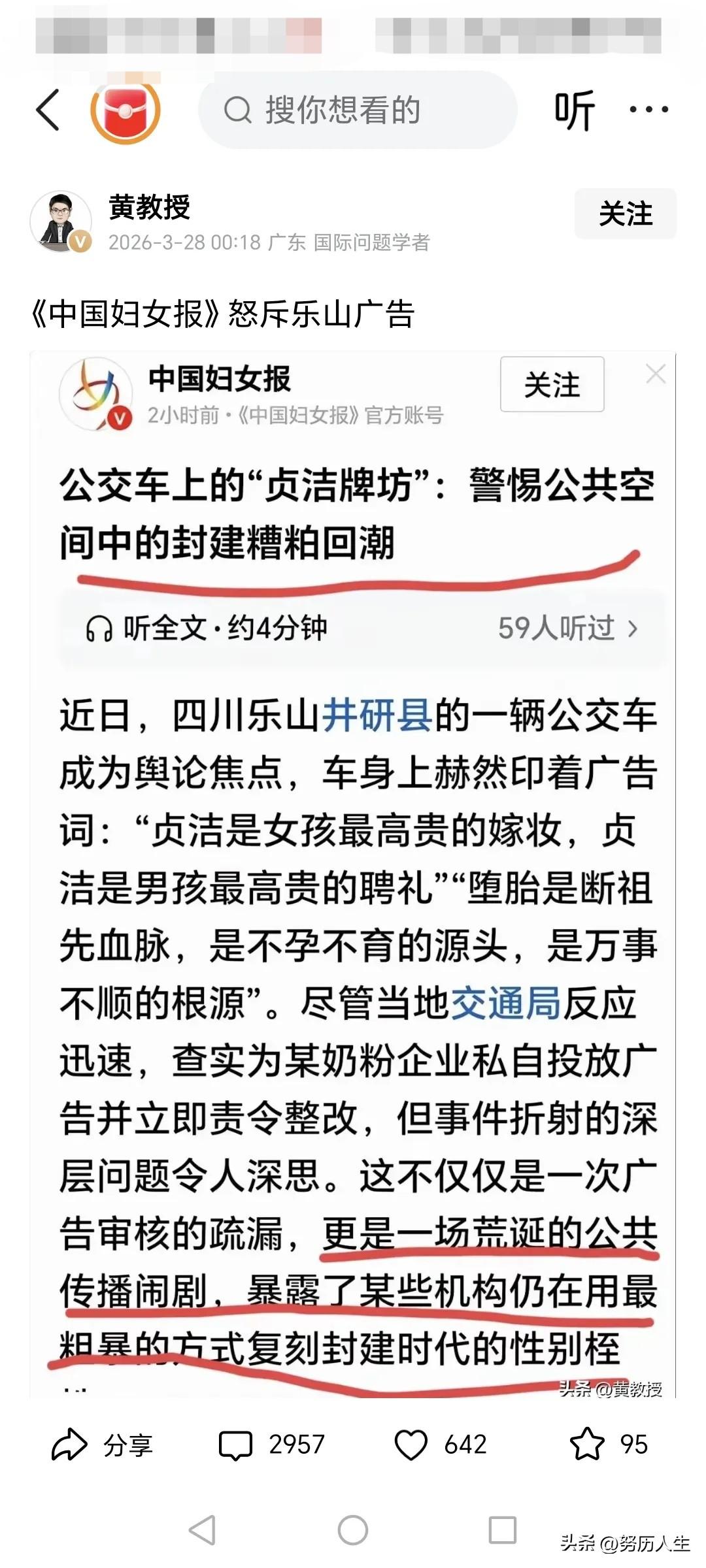 《中国妇女报》,中国新生代女性三观塑造的引导者和引路人。请你先自己走正走直了,才能发挥正面的引导作用。如果你自己都走歪了,会把新生代女性带入深渊的! 在当代社会的舆论格局中,《中国妇女报》有着不可替代的地位与作用。它不仅是面向广大女性群体的专业媒体,更是承担着价值观引导、权益普及、思想启蒙的重要平台。从社会议题讨论到女性成长指引,从家庭观念传递到职场价值倡导,这份媒体的发声往往会被众多年轻女性当作重要参考,也正因如此,公众对它的期待远高于一般自媒体。大家希望看到的是理性、公正、有温度、有底线的内容,而不是偏激、片面、容易引发对立的观点。媒体的影响力越大,肩上的责任就越重,一言一行都要经得起社会大众的审视。 当下的网络环境信息繁杂,各种思潮相互交织,很多年轻女性在成长过程中常常面临困惑。无论是婚恋选择、职场发展,还是自我价值认同,都容易受到碎片化信息的影响。一些极端言论刻意制造对立,放大焦虑,让不少人陷入情绪内耗,甚至对自身定位、家庭关系、社会环境产生误解。在这样的背景下,权威媒体的引导显得尤为重要。年轻群体需要的是客观全面的视角,而不是非黑即白的判断;需要的是理性成熟的建议,而不是煽动情绪的话术。 权威媒体想要真正发挥引路人作用,首先要做到立场端正。媒体的公信力不是凭空而来,而是长期坚持客观公正、坚守社会责任积累而来。如果发声缺乏分寸,观点过于极端,甚至为了流量迎合某些片面思潮,就会慢慢消耗公众的信任。尤其是面向新生代女性的内容,更要兼顾现实国情、公序良俗与个体成长,不能脱离大多数人的生活实际,更不能把偏激观念包装成先进思想进行传播。一旦引导方向出现偏差,受到影响的就是一大批正在树立三观的年轻人。 很多年轻女性正处在价值观成型的关键阶段,辨别能力有限,很容易被长期灌输的单一观念影响。她们需要的是鼓励独立自强,同时懂得尊重与包容;需要追求个人价值,也能理性看待家庭与社会关系。权威媒体的责任,是帮助她们建立健全的认知,而不是加剧焦虑、制造对立。如果媒体自身方向不稳,传递出偏激片面的内容,可能会让一些女性陷入认知误区,影响人生选择,甚至对自身成长和周围环境产生不必要的抵触情绪。 真正负责任的引导,从来不是走极端、博眼球,而是坚守底线、保持理性、兼顾多方视角。媒体要站在客观公正的立场,传递尊重、平等、理性、向善的理念,既要维护女性的合法权益,也要倡导和谐健康的社会氛围。只有自身行得正、立得稳,始终坚守初心和社会责任,才能赢得长久的信任,才能真正成为新生代女性成长路上可靠的引导者,帮助更多女性树立健康正向的三观,稳步走好人生道路。 各位读者你们怎么看?欢迎在评论区讨论。