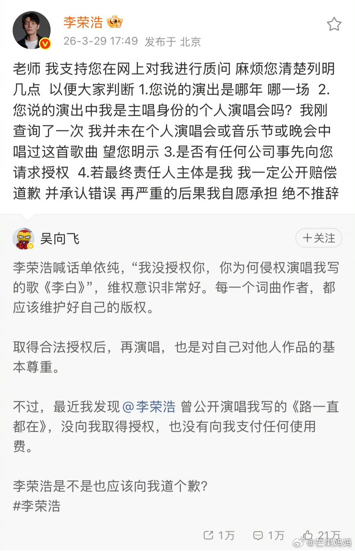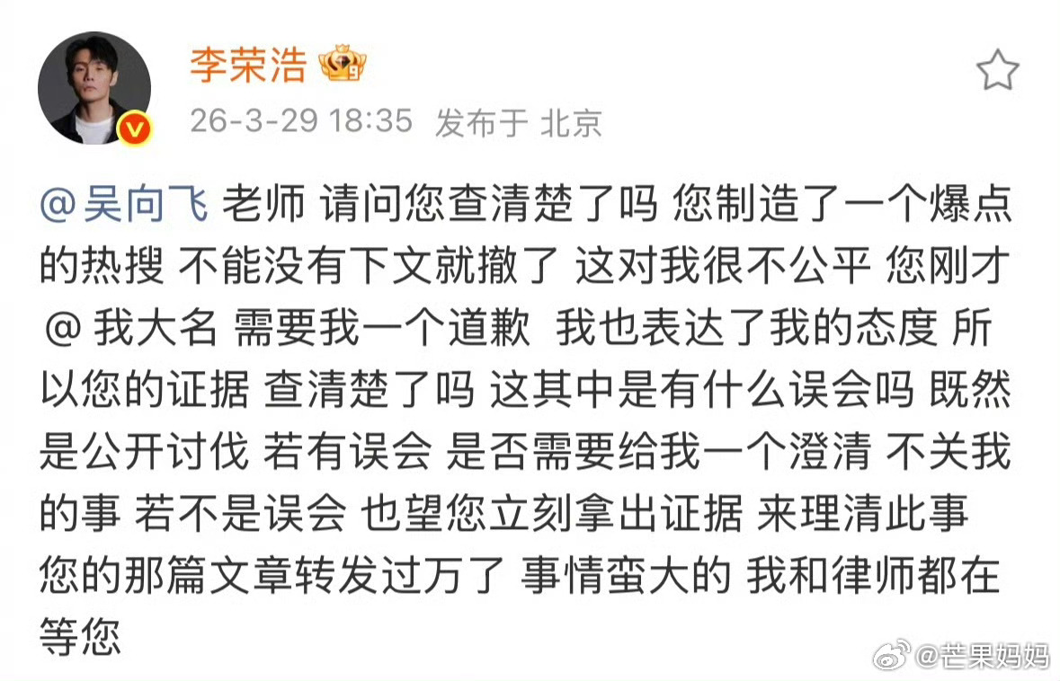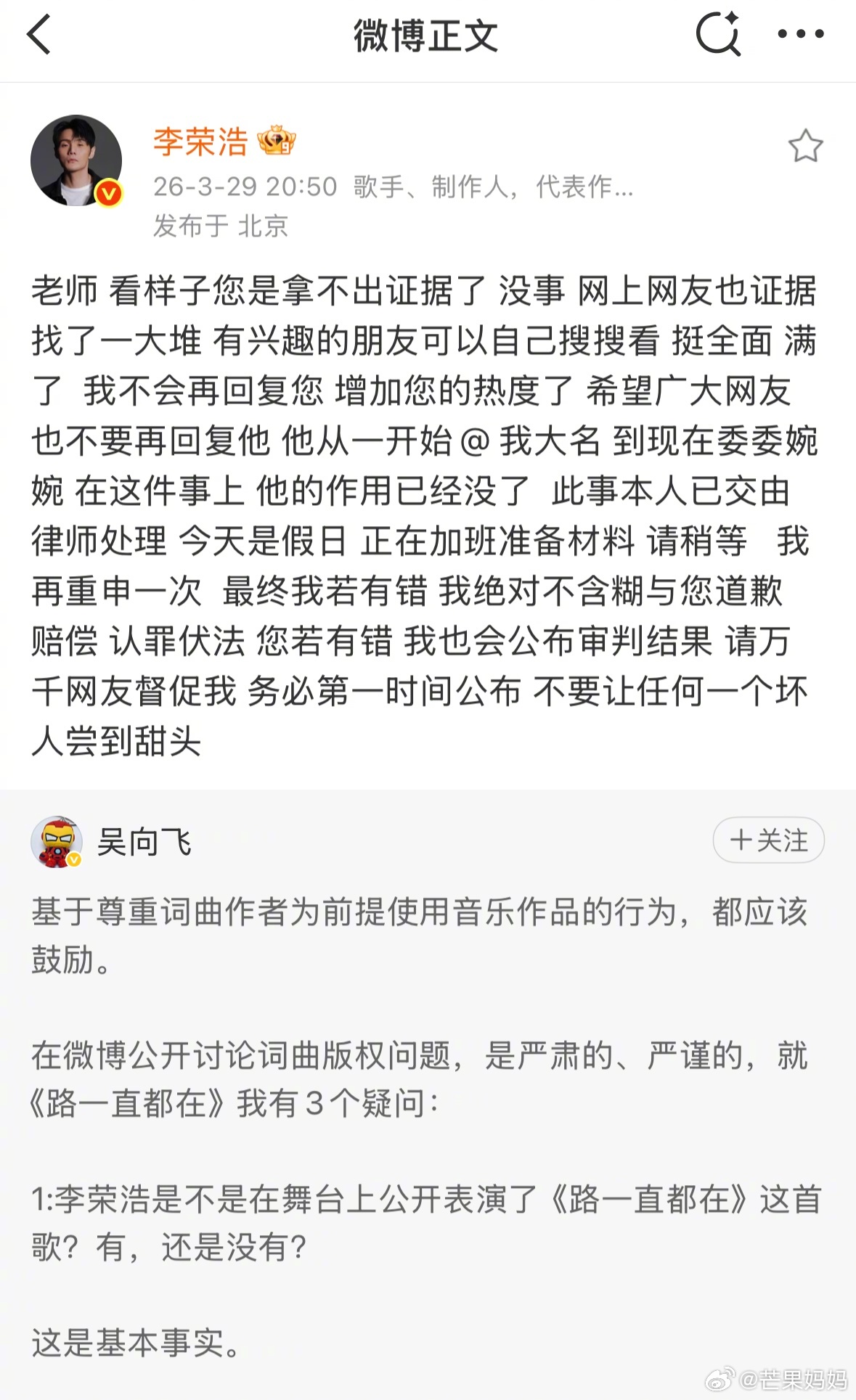 吴向飞喊话李荣浩道歉不要让任何一个坏人尝到甜头,李荣浩这还有callback呢
