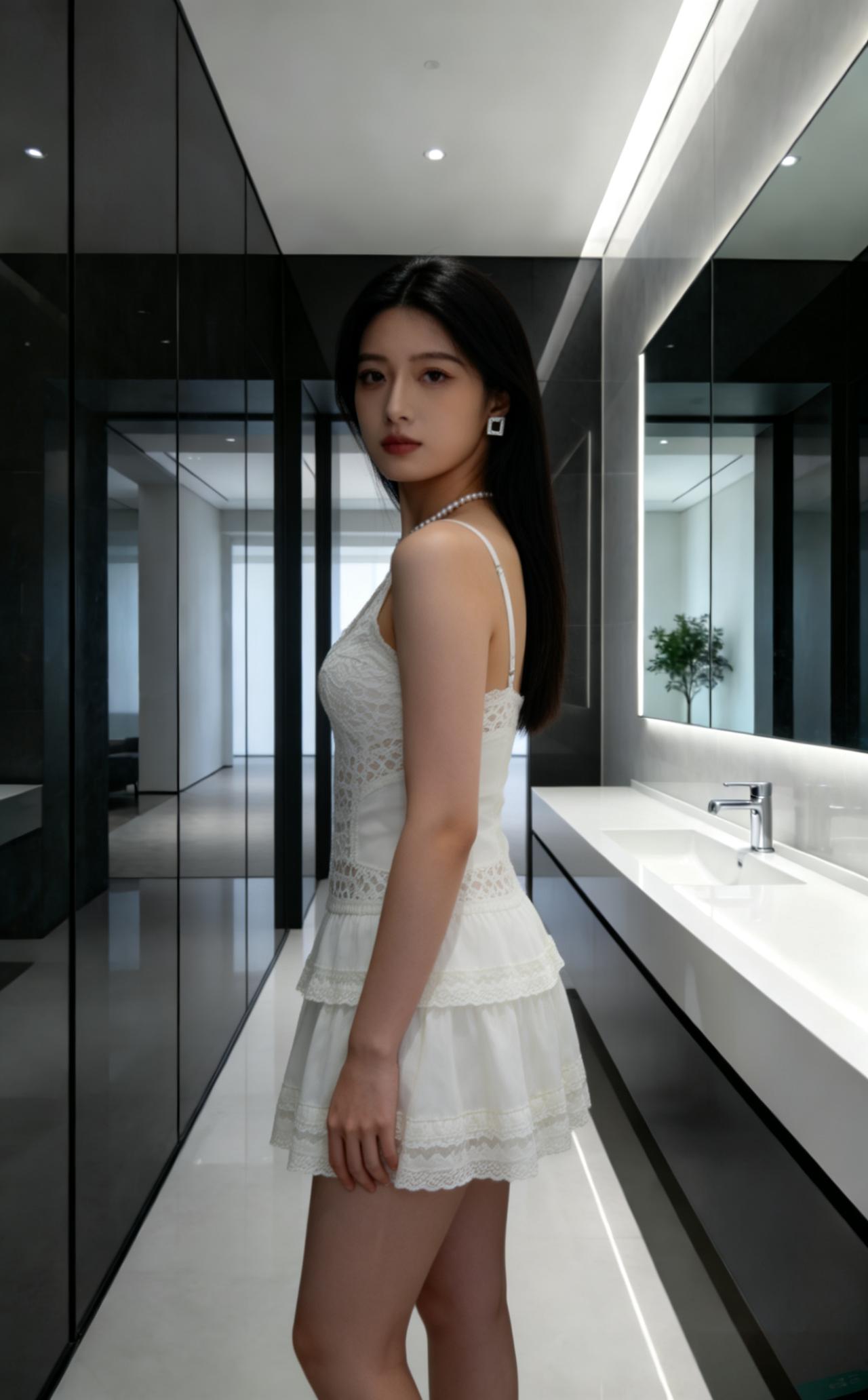 米白色披肩式外套, 内搭白色蕾丝连衣裙, 裙身层叠荷叶边,设计尽显柔美; 气质优雅又带着几分从容妩媚。