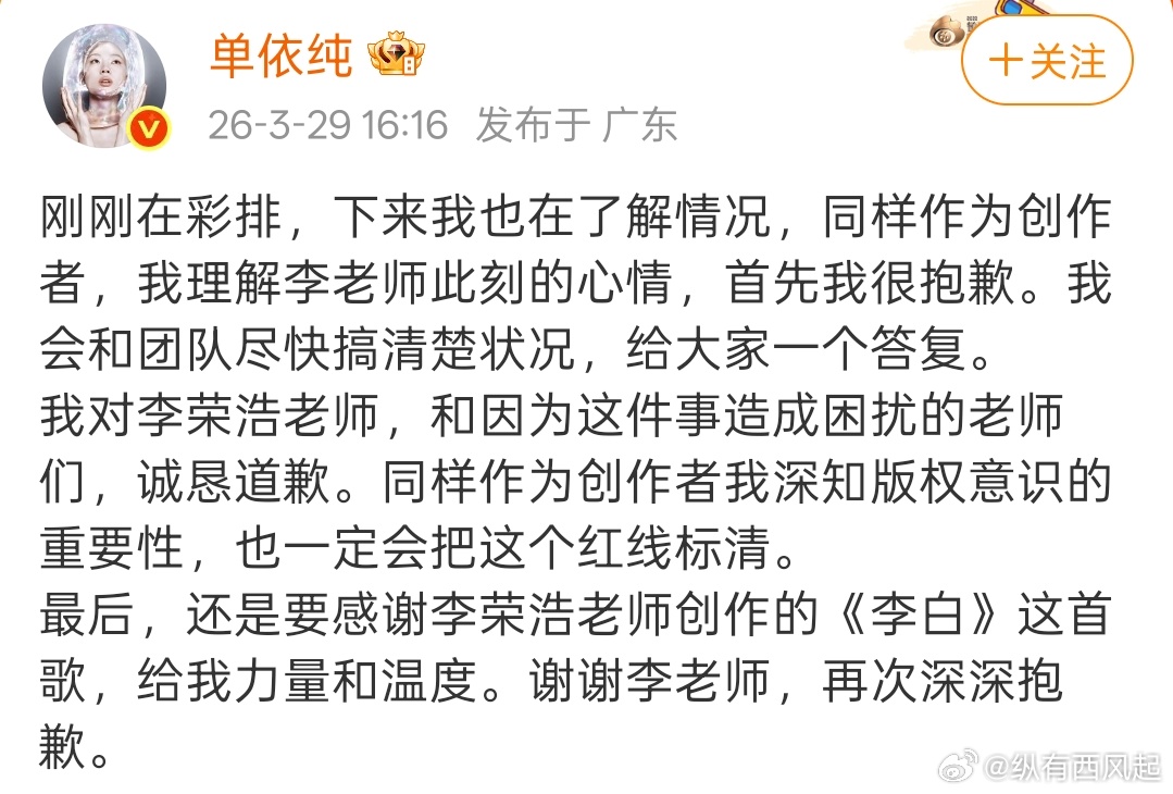 李荣浩4连质问单依纯支持维权,支持创作版权,既然单依纯已经道歉了就赶紧补缴一下版权费吧