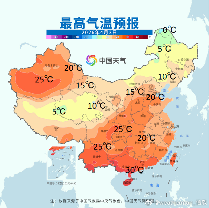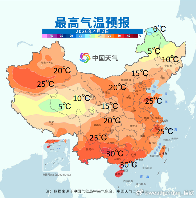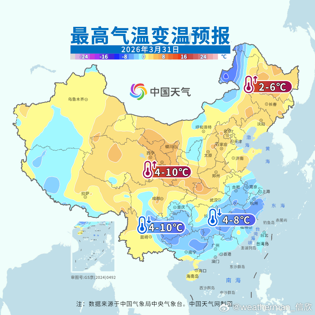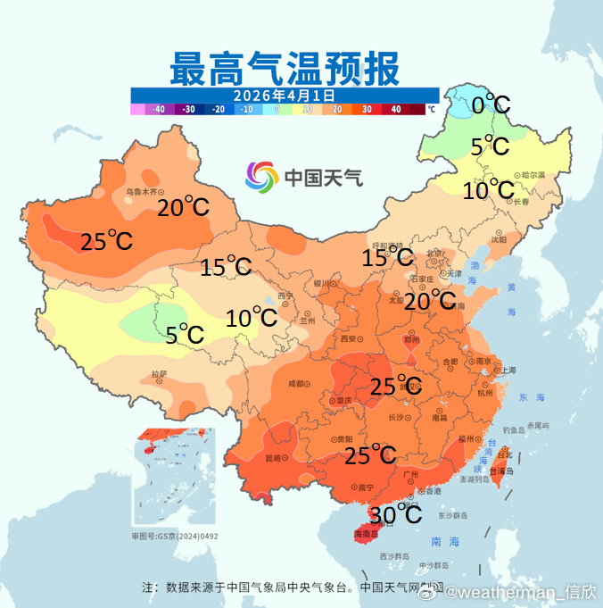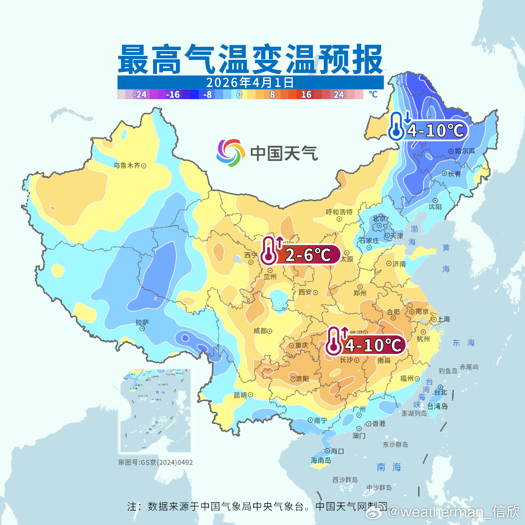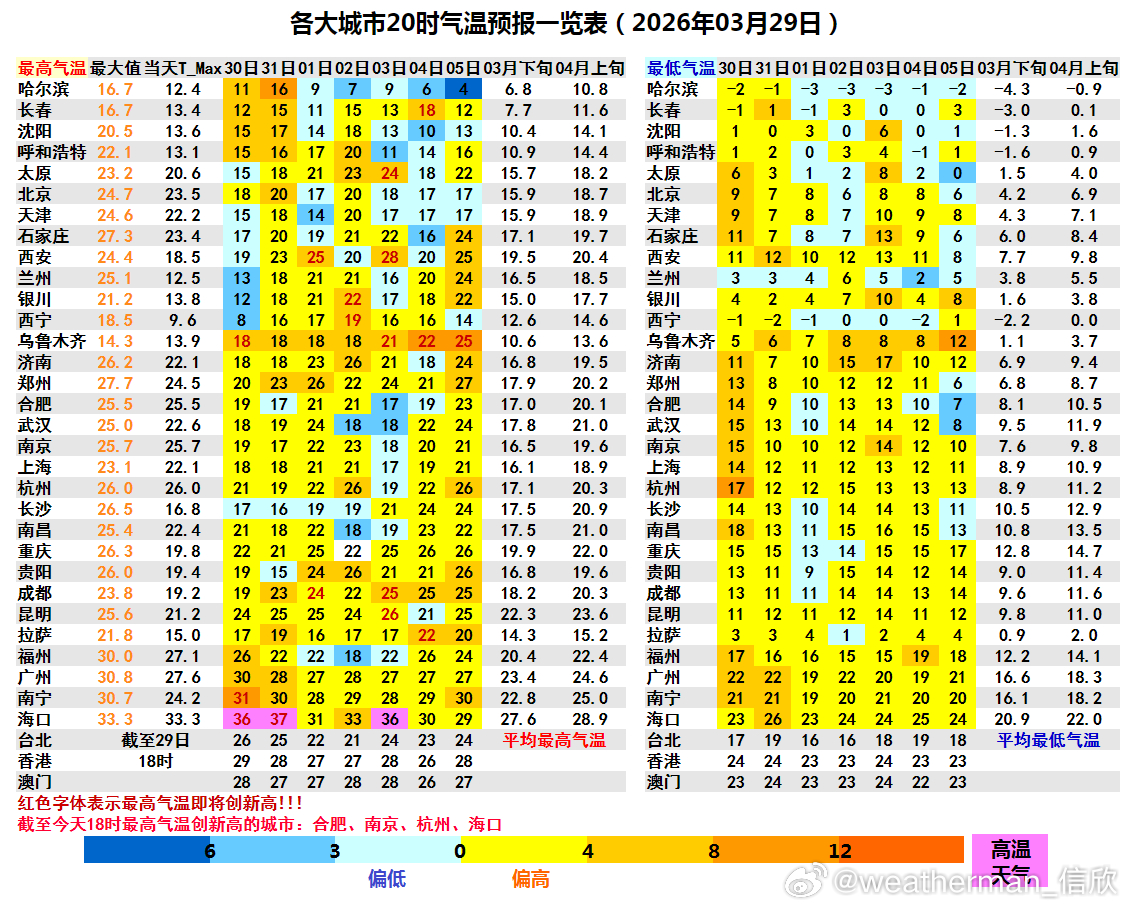 4月1日,冷空气继续南下,海口最高降至31℃,高温结束。而4月1日还有另外一股冷空气影响内蒙古东部和东北三省。而且4月上旬东北一带的冷空气活跃,哈尔滨气温将震荡走低。相反,西北地区暖脊发展,乌鲁木齐气温步步高。新疆和东北的气温,经常如同跷跷板,因为处于槽脊的不同位置,会出现一边偏高,一边偏低的情况。