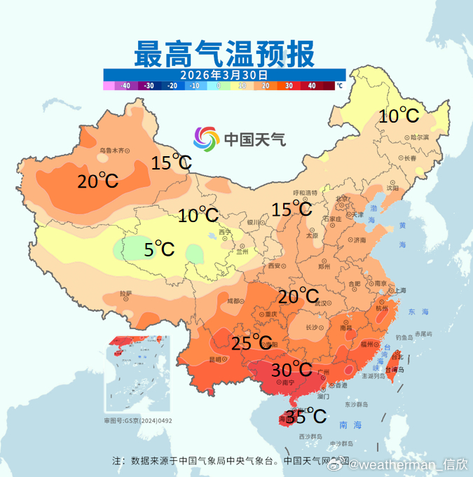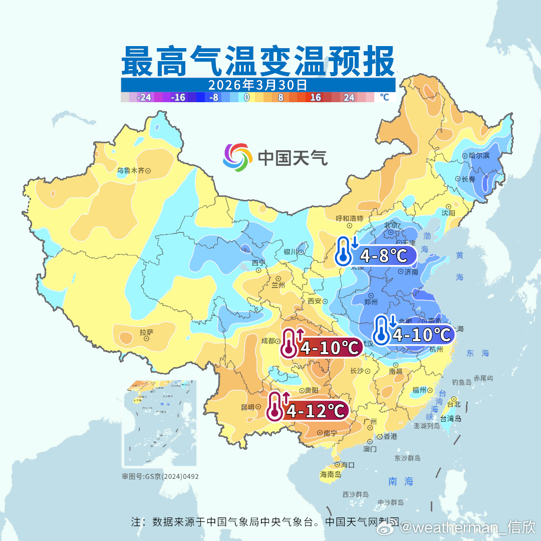 【气温】今天有4个省会城市气温创新高,合肥25.5℃、南京25.7℃、杭州26℃、海口33.3℃。明天因为冷空气加阴雨的影响,合肥、南京最高气温降至19℃,杭州最高降至21℃。后天冷空气会继续南下,影响江南华南更多地方。但未来2天,冷空气暂时影响不到海南,海南高温会增多。海口明天有可能拿下今年省会城市首个高温。