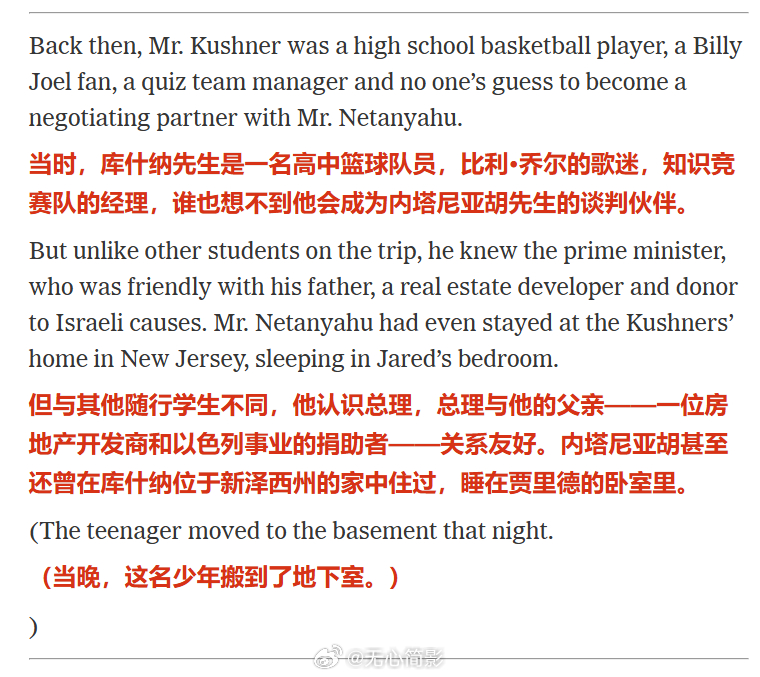 回顾《纽约时报》在2017年介绍特朗普女婿库什纳的文章,里面提到,以色列总理内塔尼亚胡和他家的关系非常亲密,内塔尼亚胡甚至还在库什纳位于新泽西的家中住过,当晚就睡在库什纳的卧室里